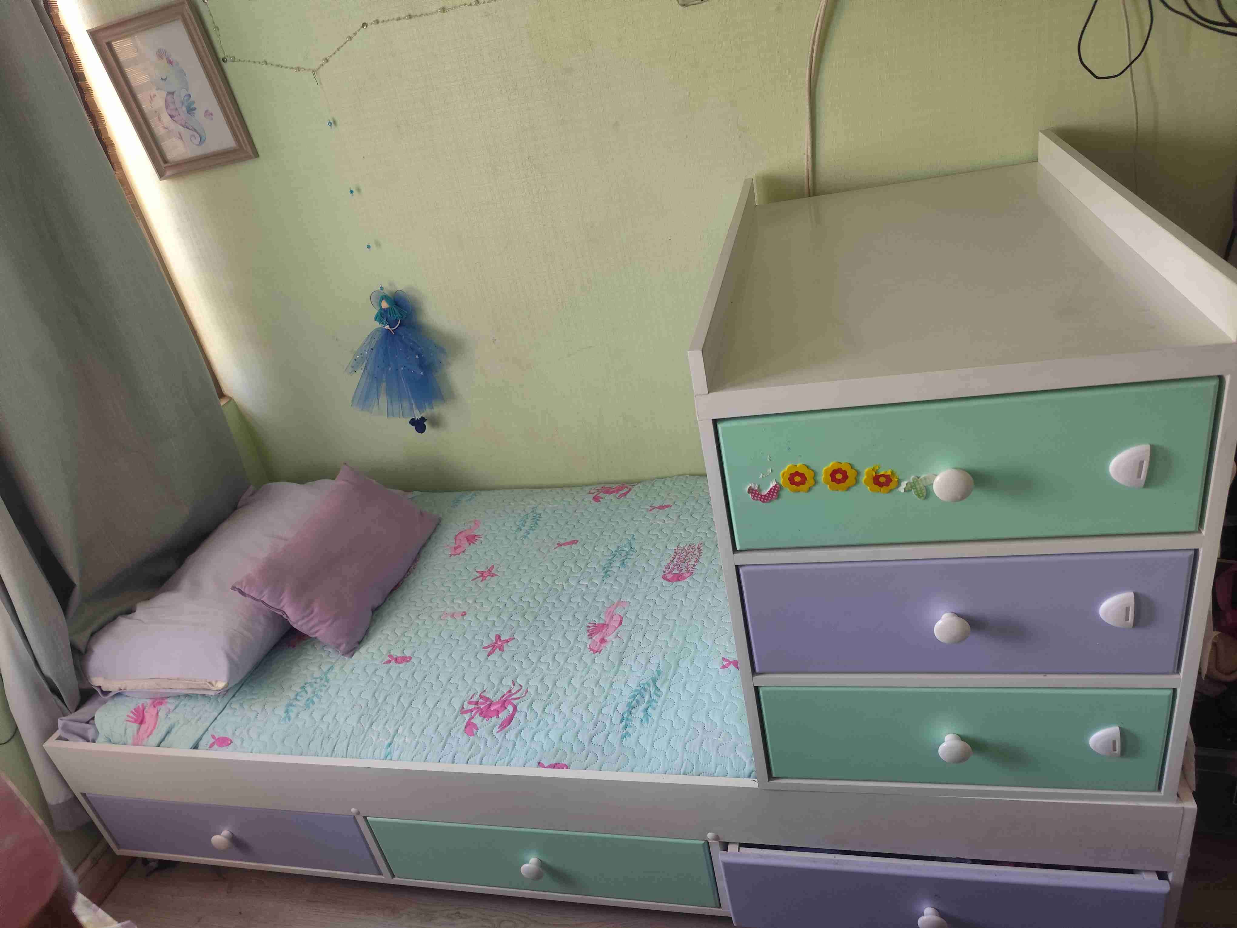 Cama infantil multicolor con cajonera integrada. En excelentes condiciones,casi sin uso, ideal para habitación de niño o niña. La cajonera se desmonta y queda como velador viene con colchón de transición