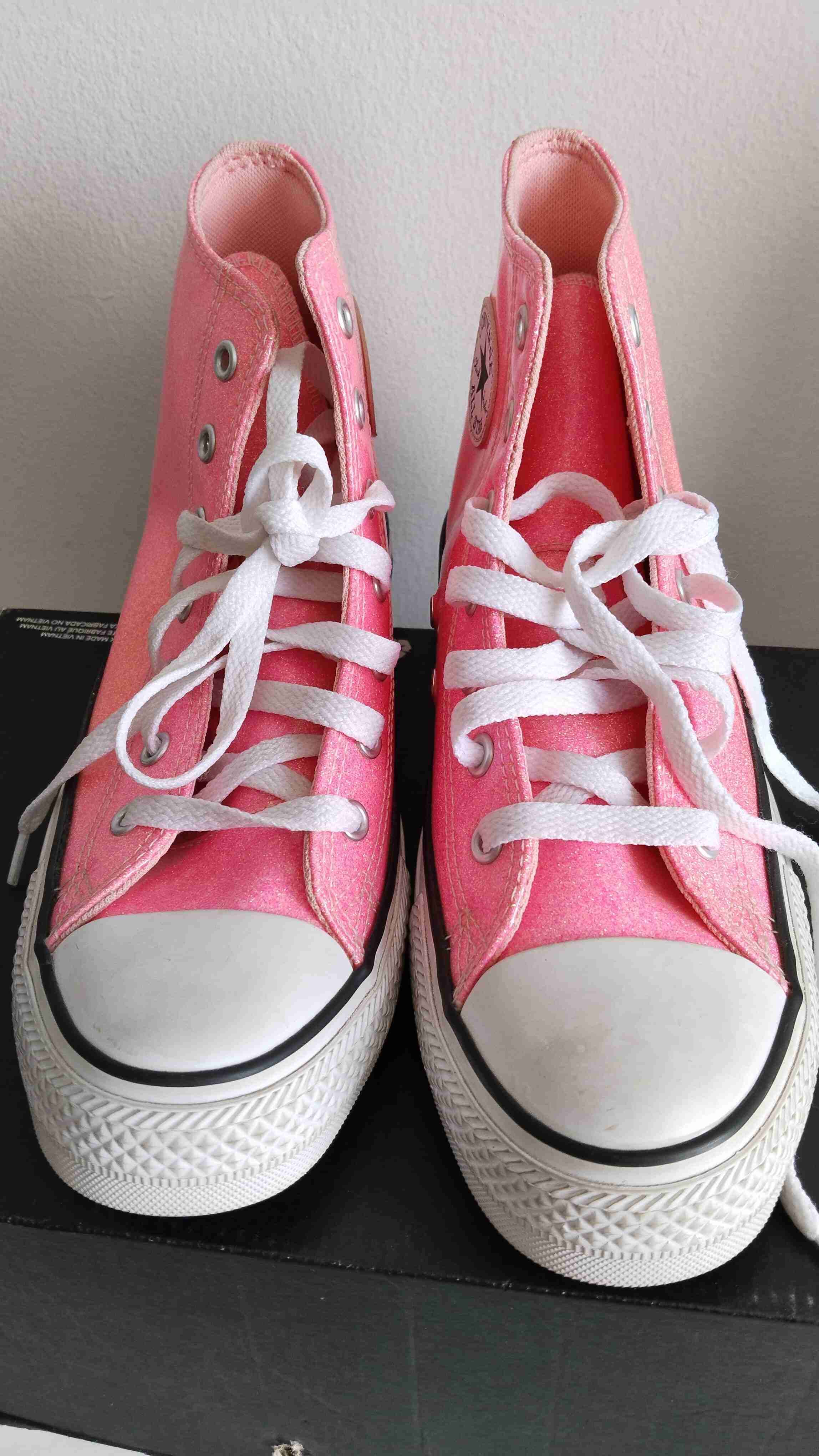 Zapatillas en tono rosado con brillos, diseño clásico y atractivo. En buen estado, sin uso