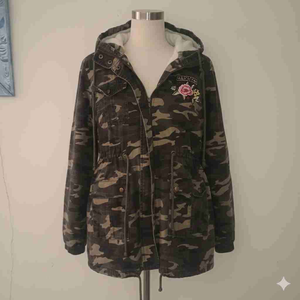 Parka camuflada con bordado de rosa, ideal para el invierno. En buen estado.Solo le falta un botón en el bolsillo, lo demás impecable.