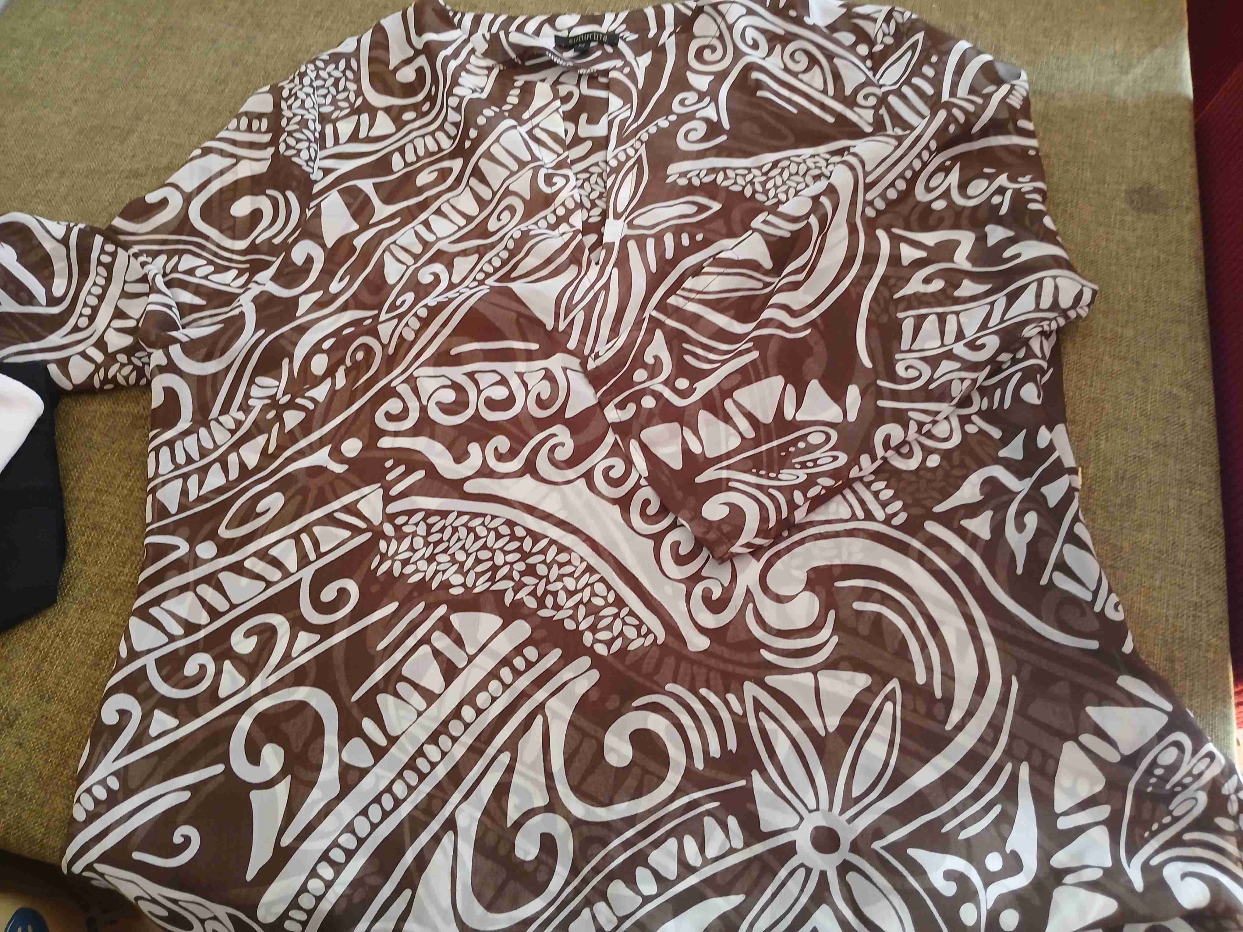 Blusa con diseño tribal en tonos marrones y blancos, en buen estado. Ideal para un look casual.