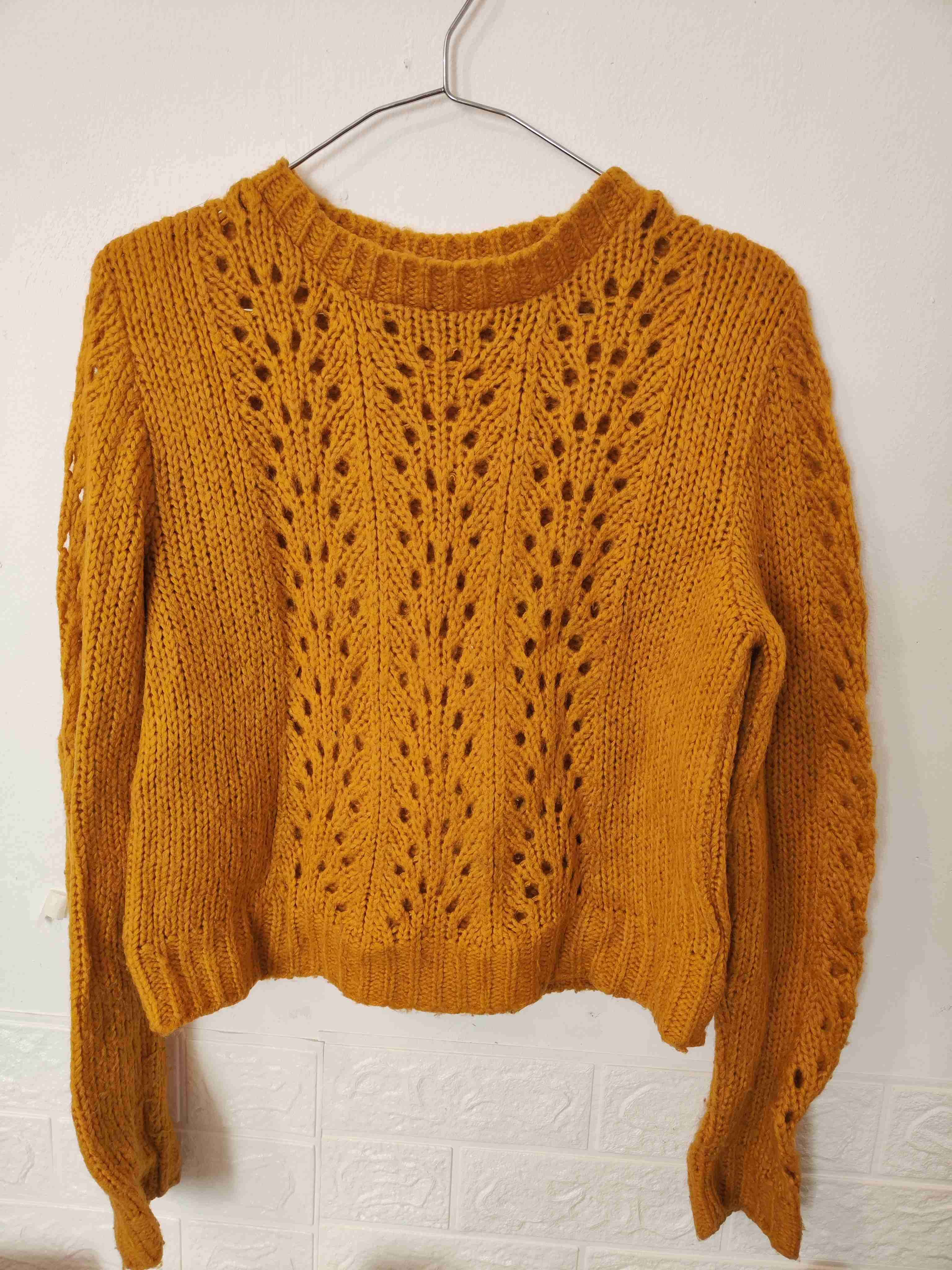 Suéter tejido color mostaza con diseño calado. Ideal para mantenerte abrigada con estilo. Buen estado general.