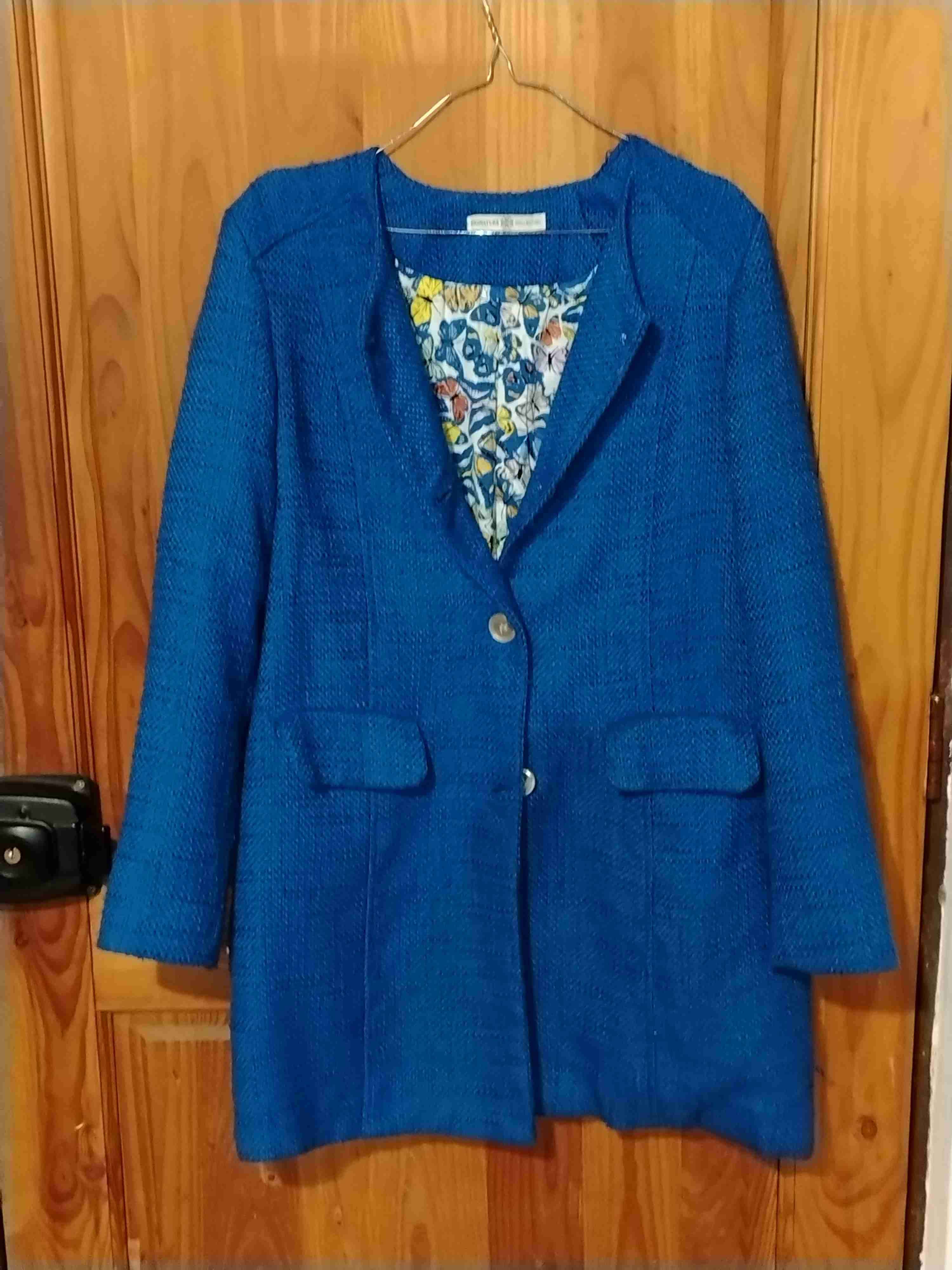 Elegante abrigo azul con interior de diseño de mariposas. Perfecto para el invierno, buen estado general. La etiqueta dice L, pero parece ser una M