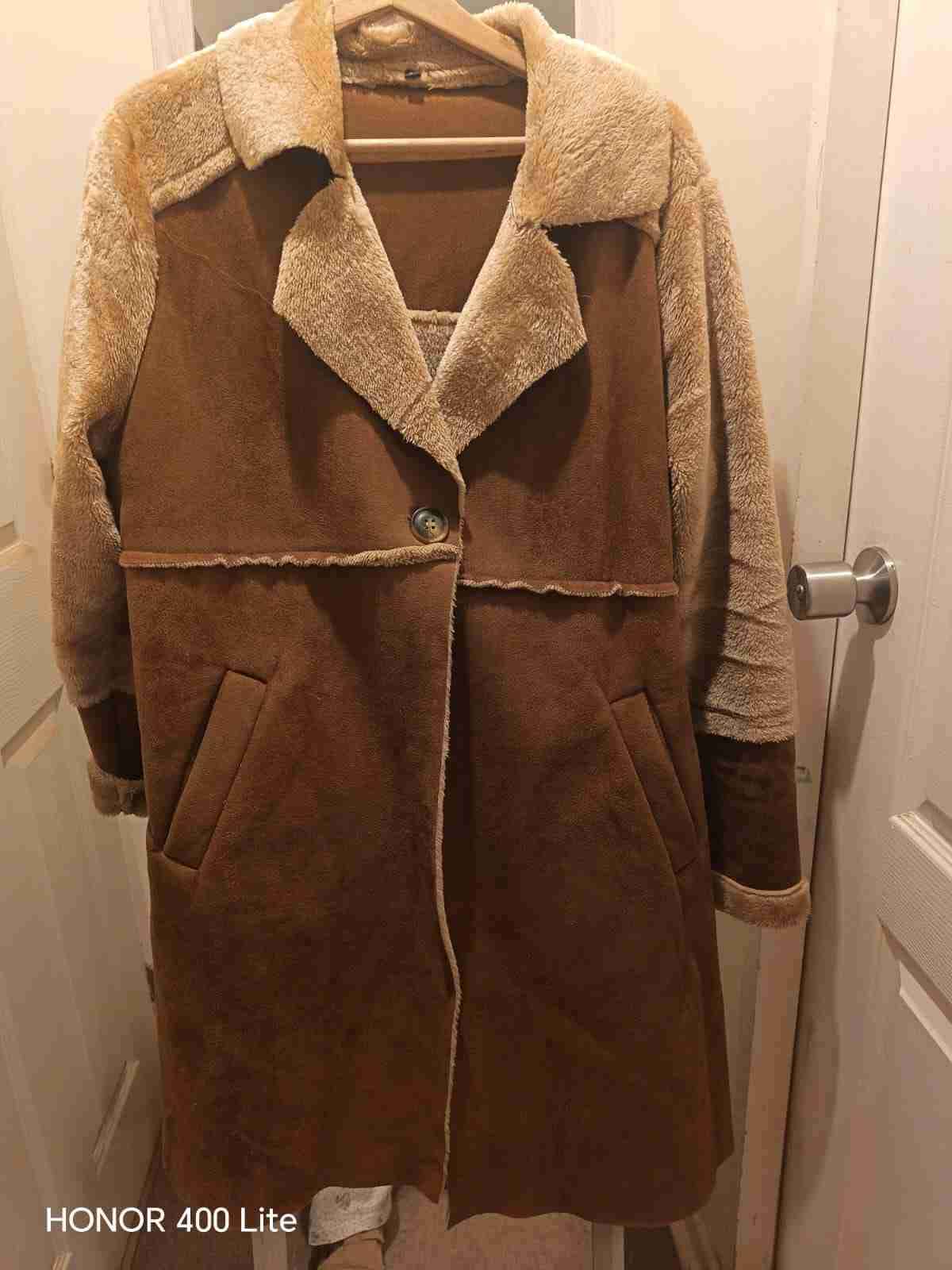 Elegante abrigo marrón con interior peludo, ideal para el invierno. En buen estado, perfecto para mantener el calor.