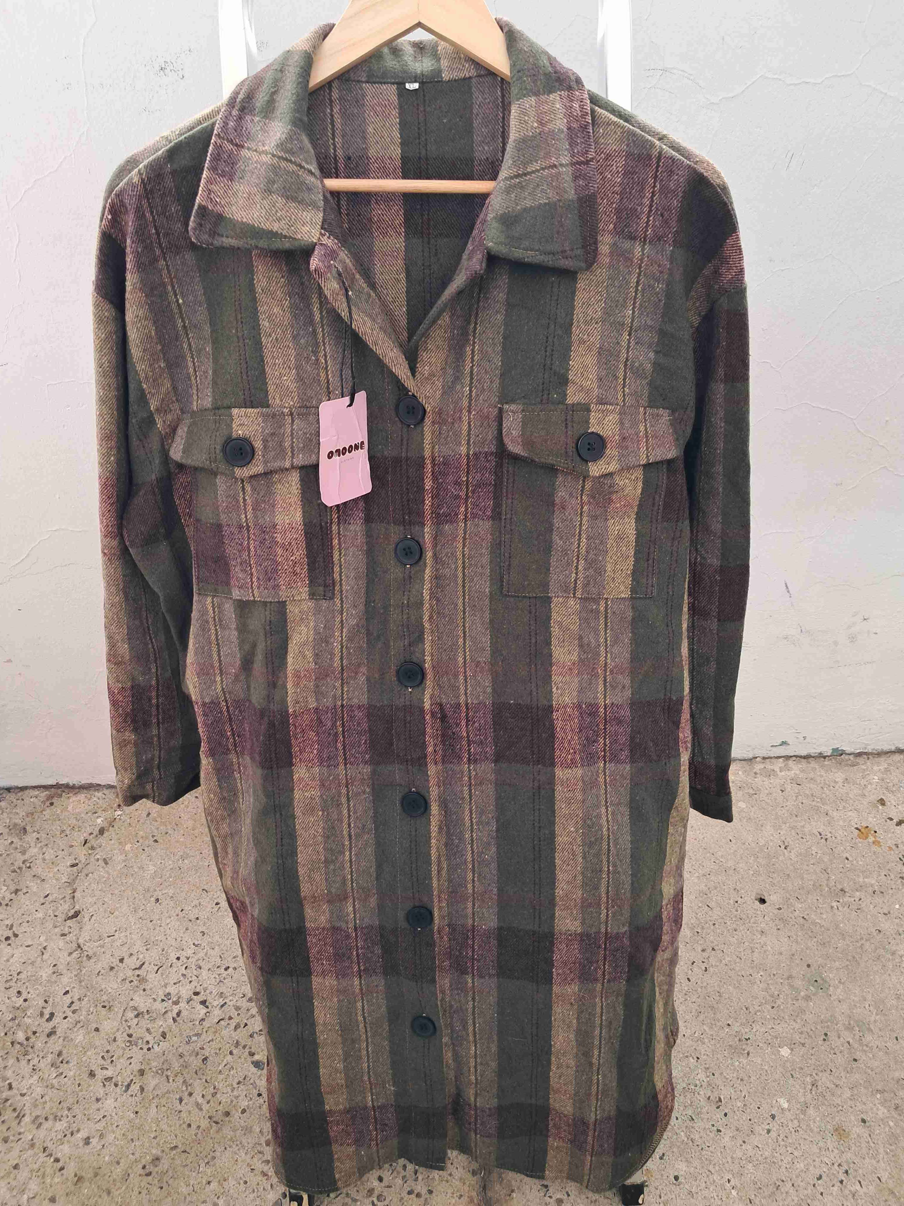 Abrigo estilo camisa largo, a cuadros con bolsillos en el pecho. Perfecto para días fríos.