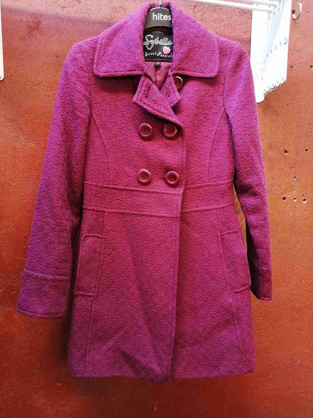 Elegante abrigo fucsia con doble botonadura y cierre entallado. Ideal para el invierno, en excelente estado. Talla 38 o S