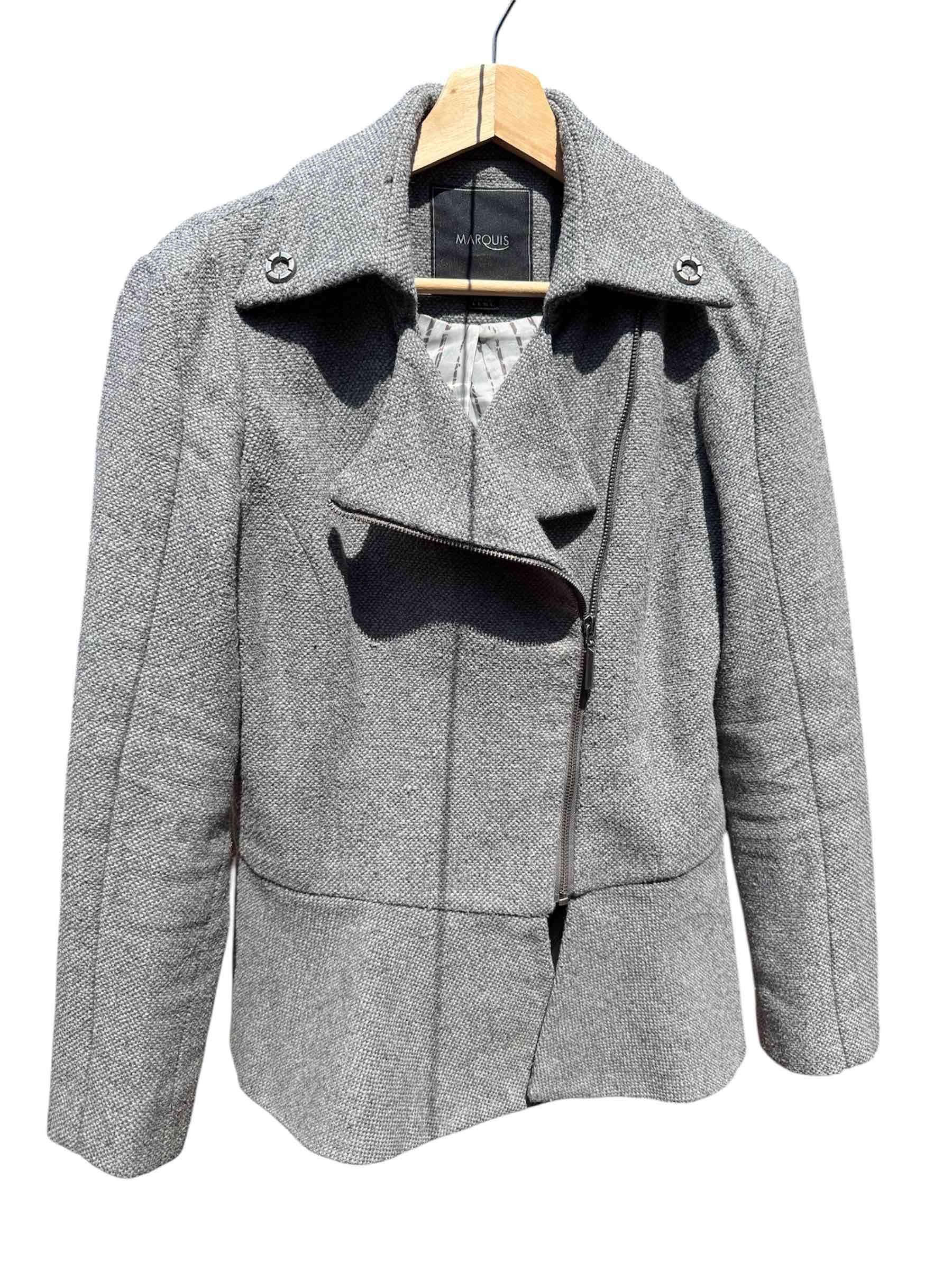 Abrigo gris de estilo moderno, ideal para días frescos. En buen estado con cierre asimétrico.