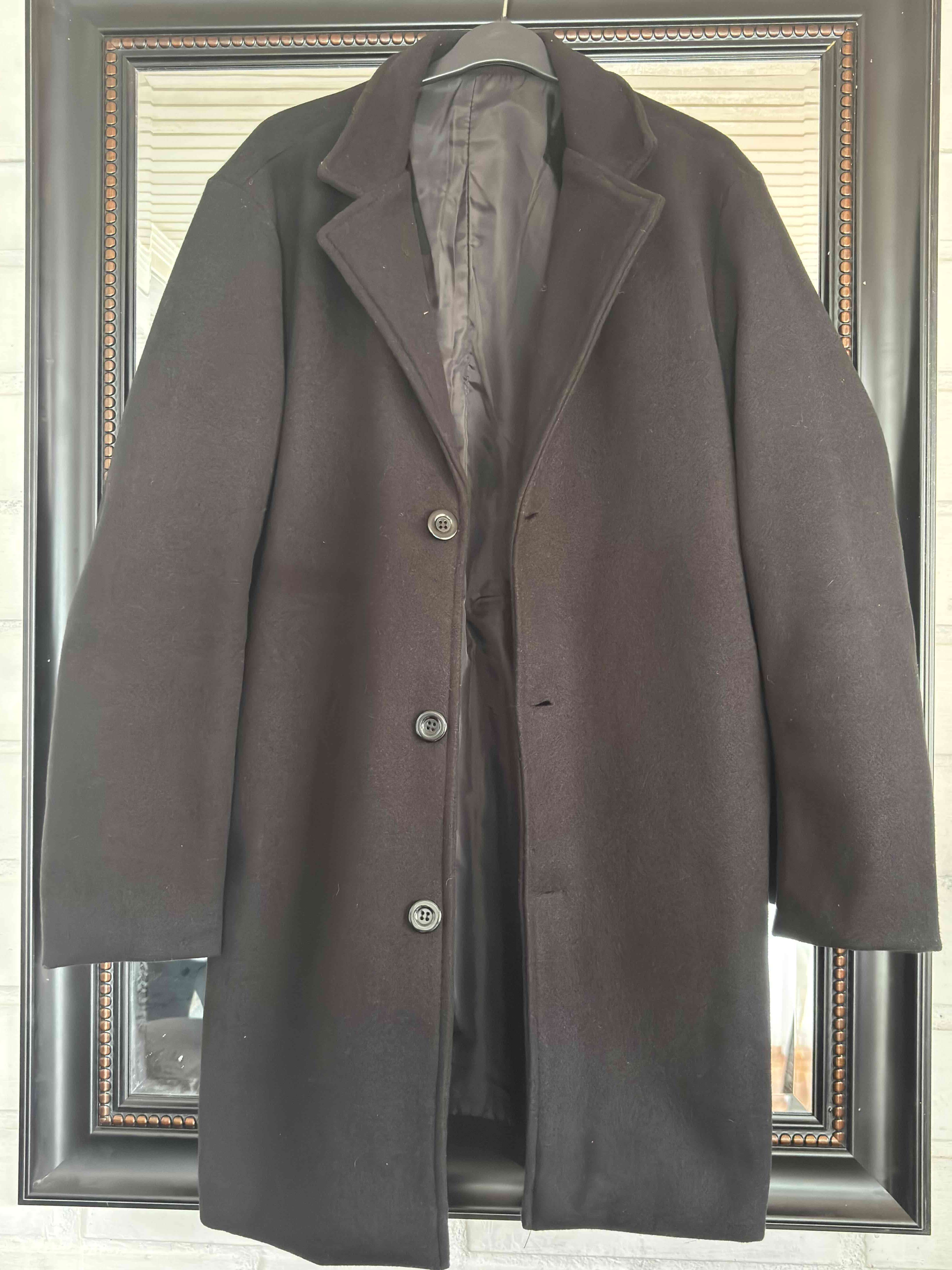 Abrigo largo negro y gris de estilo clásico. Ideal para invierno y ocasiones formales. Talla M