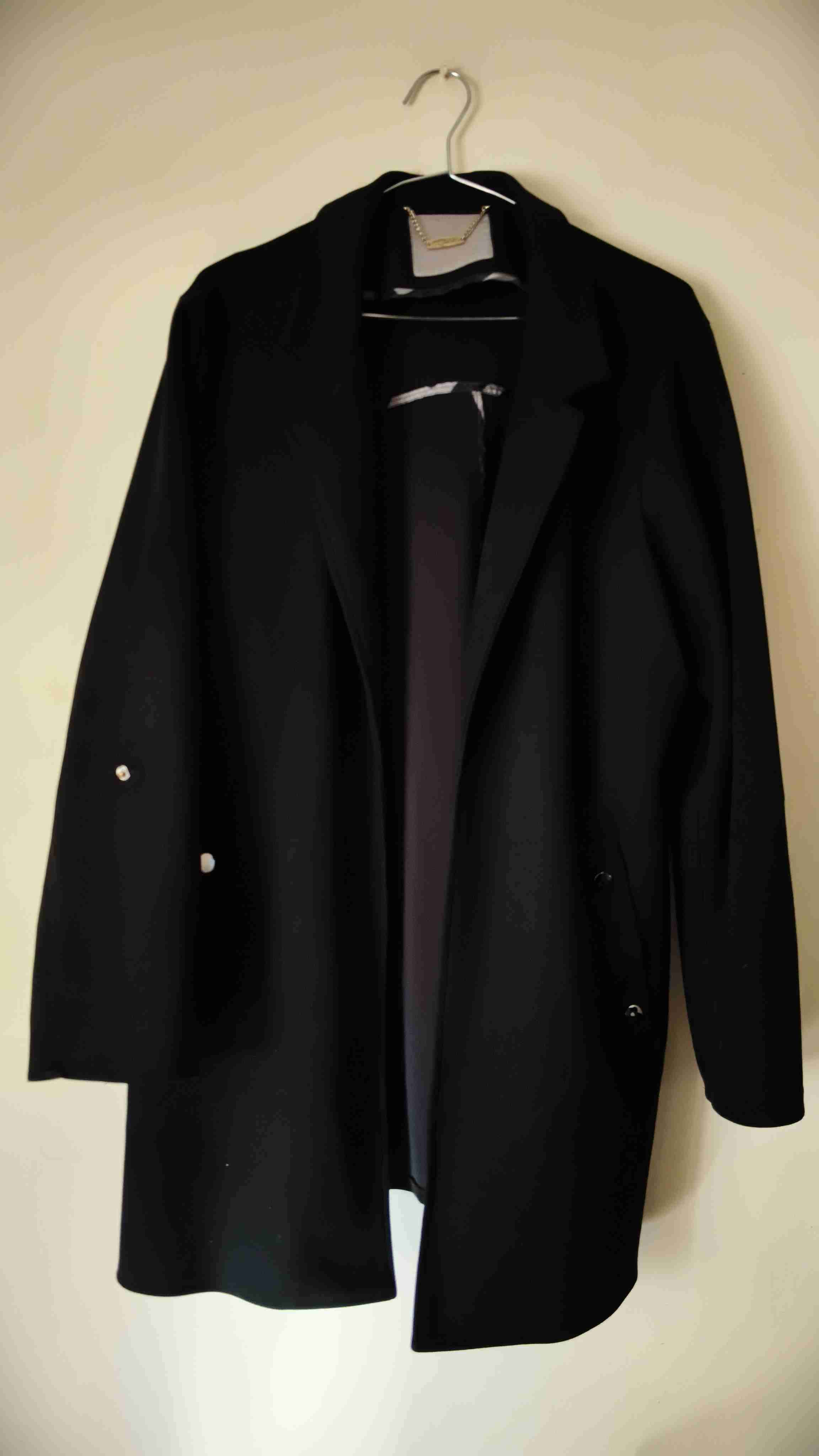 Abrigo negro de estilo clásico, ideal para ocasiones formales. En buen estado con botones elegantes.