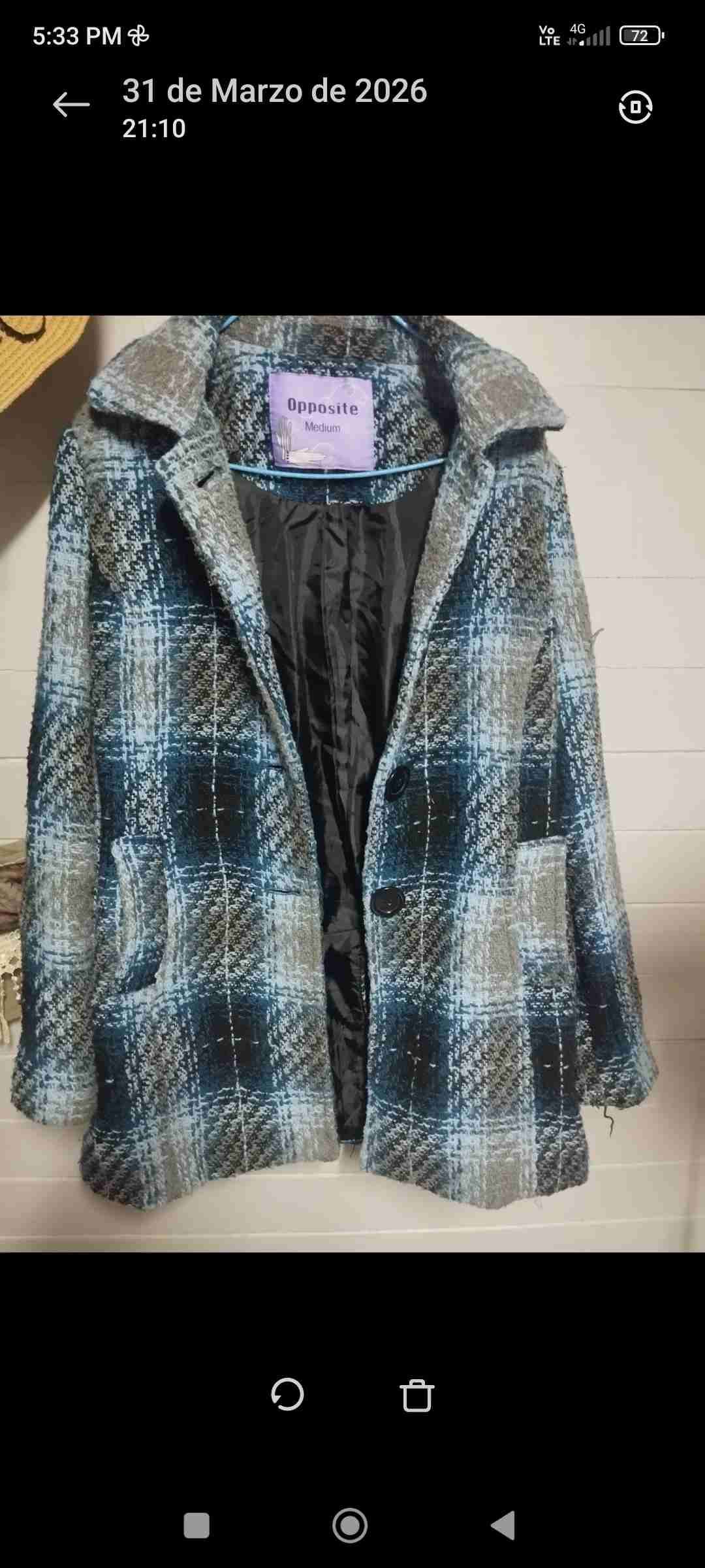 Abrigo de lana con diseño a cuadros en azul y gris, ideal para el invierno. En buen estado, talla M