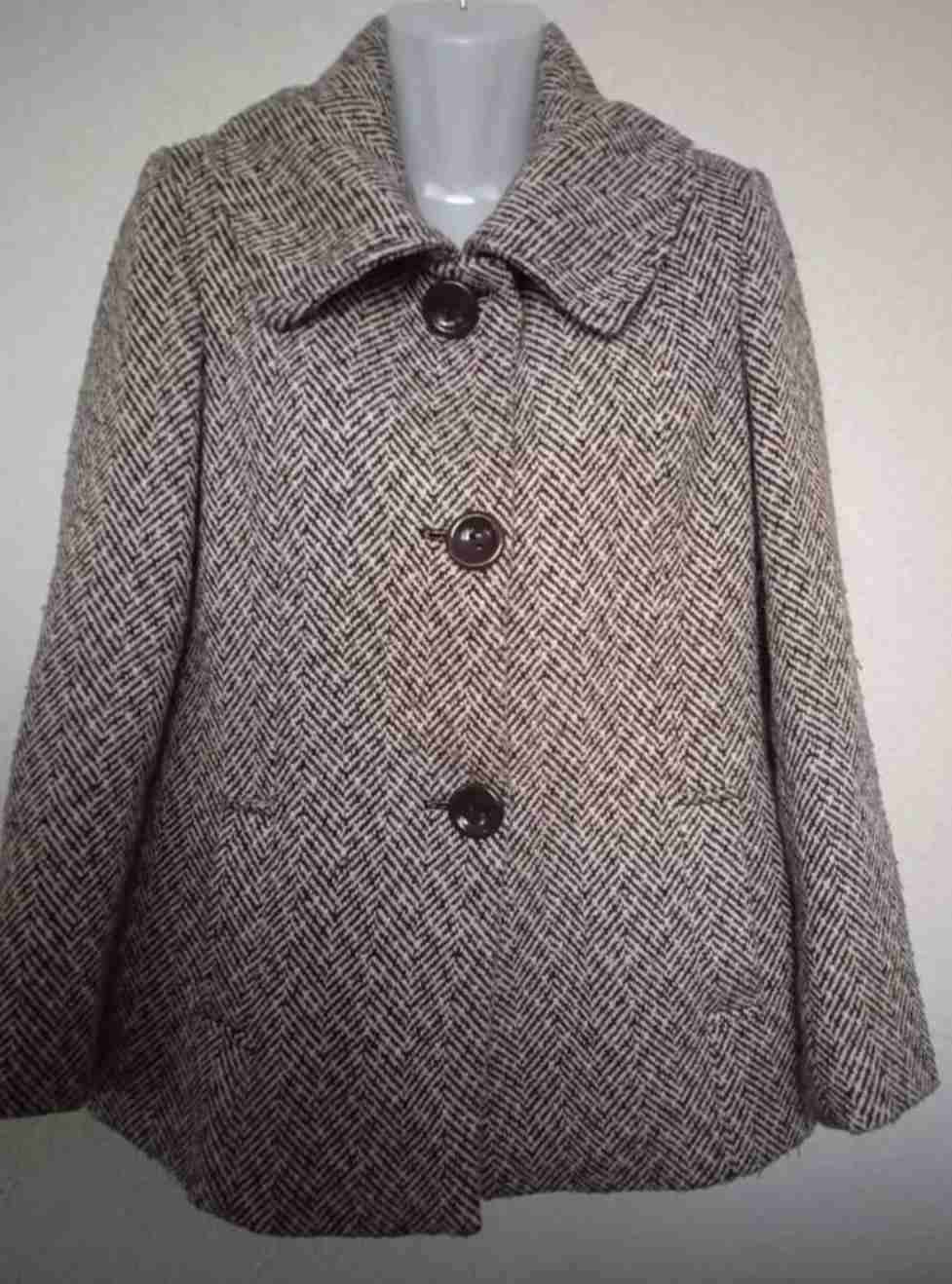 Abrigo Signus elegante de lana en tonos café y beige, ideal para el invierno. Estado general bueno con diseño clásico. Talla 38
