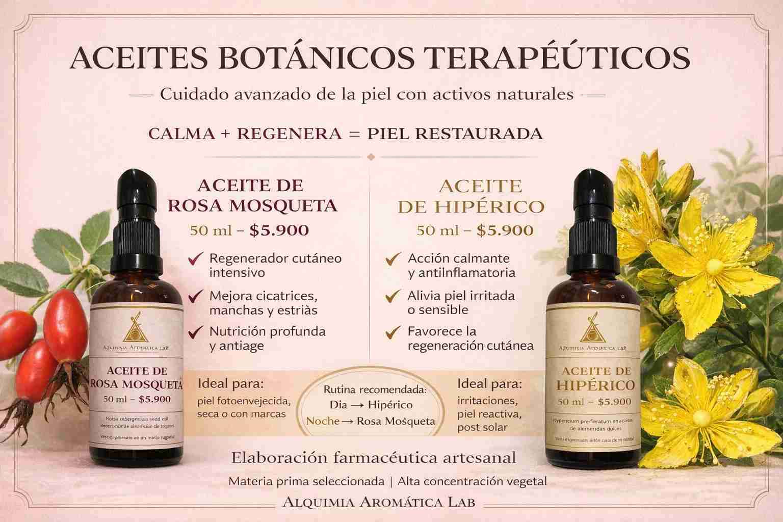 Aceite de rosa mosqueta y hipérico de 50 ml cada uno. Regenerador cutáneo, calma y nutre intensivamente.