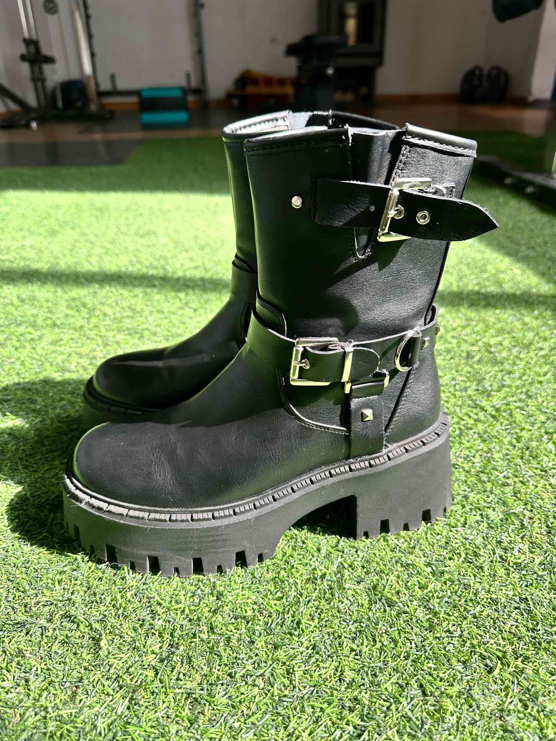 Elegantes botines de cuero negro con hebillas y suela gruesa. Perfectos para un look casual o rockero. En buen estado, con leves signos de uso.