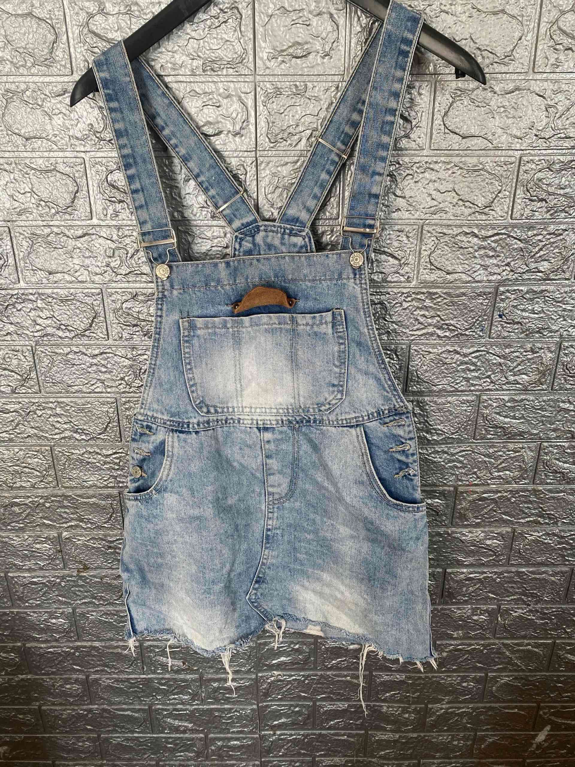 Jardinera corta de mezclilla azul desgastada. Perfecta para un look casual y relajado. En buen estado con leves signos de uso.