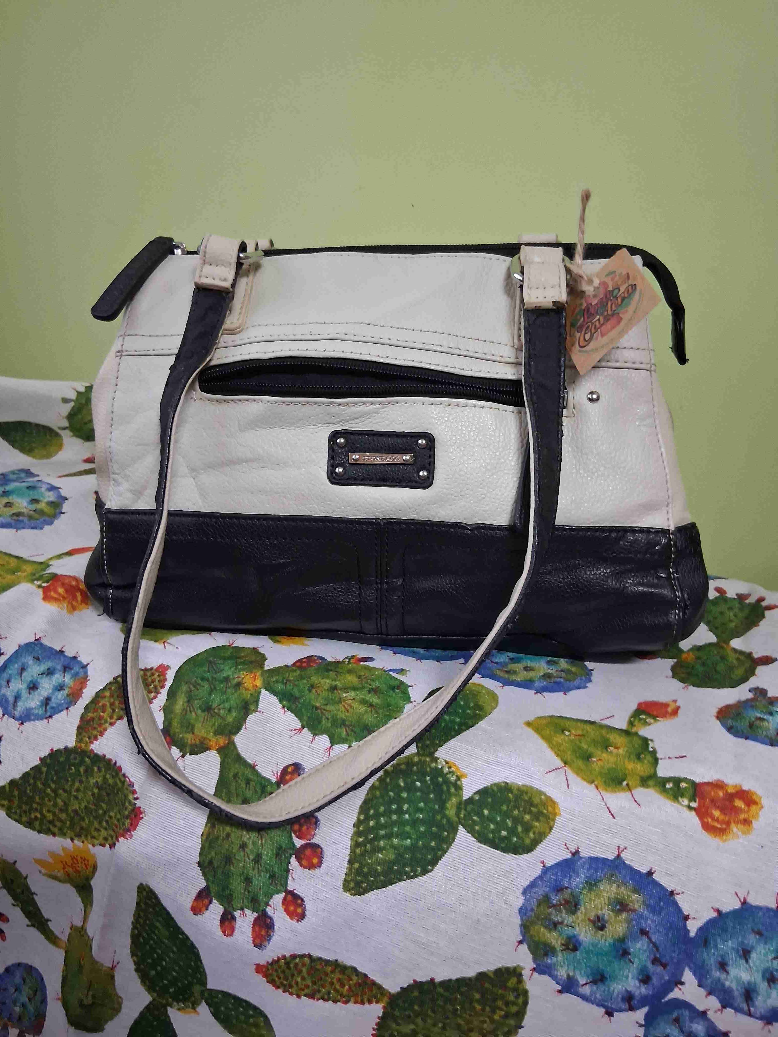 Bolso elegante en blanco y negro, perfecto para uso diario. En buen estado, con cierre y varios compartimentos.