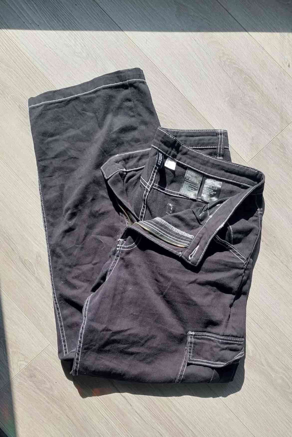 Pantalones cargo de color negro con costuras en contraste. En buen estado, ideales para un look casual o de trabajo.