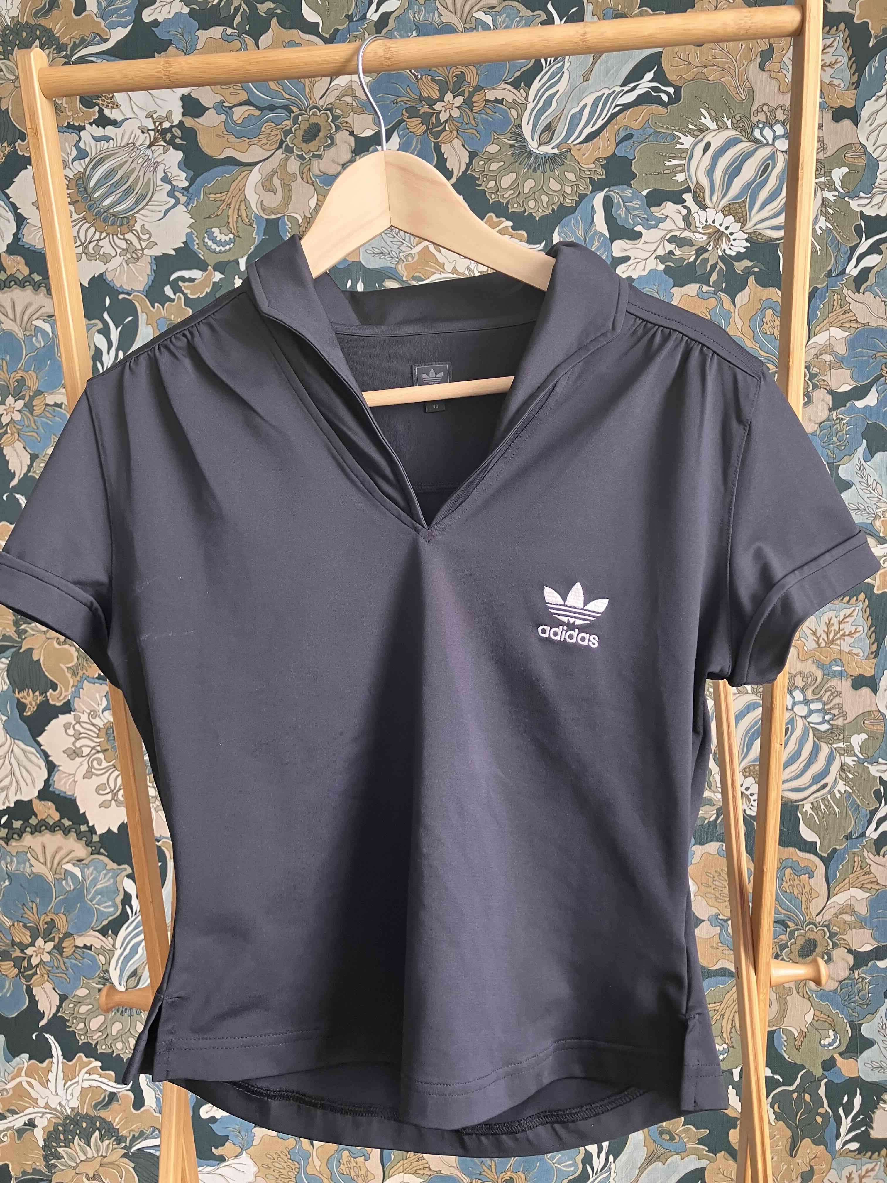 Polera deportiva negra de Adidas vintage, ideal para entrenamientos o uso casual. Buen estado general, con logo visible.
