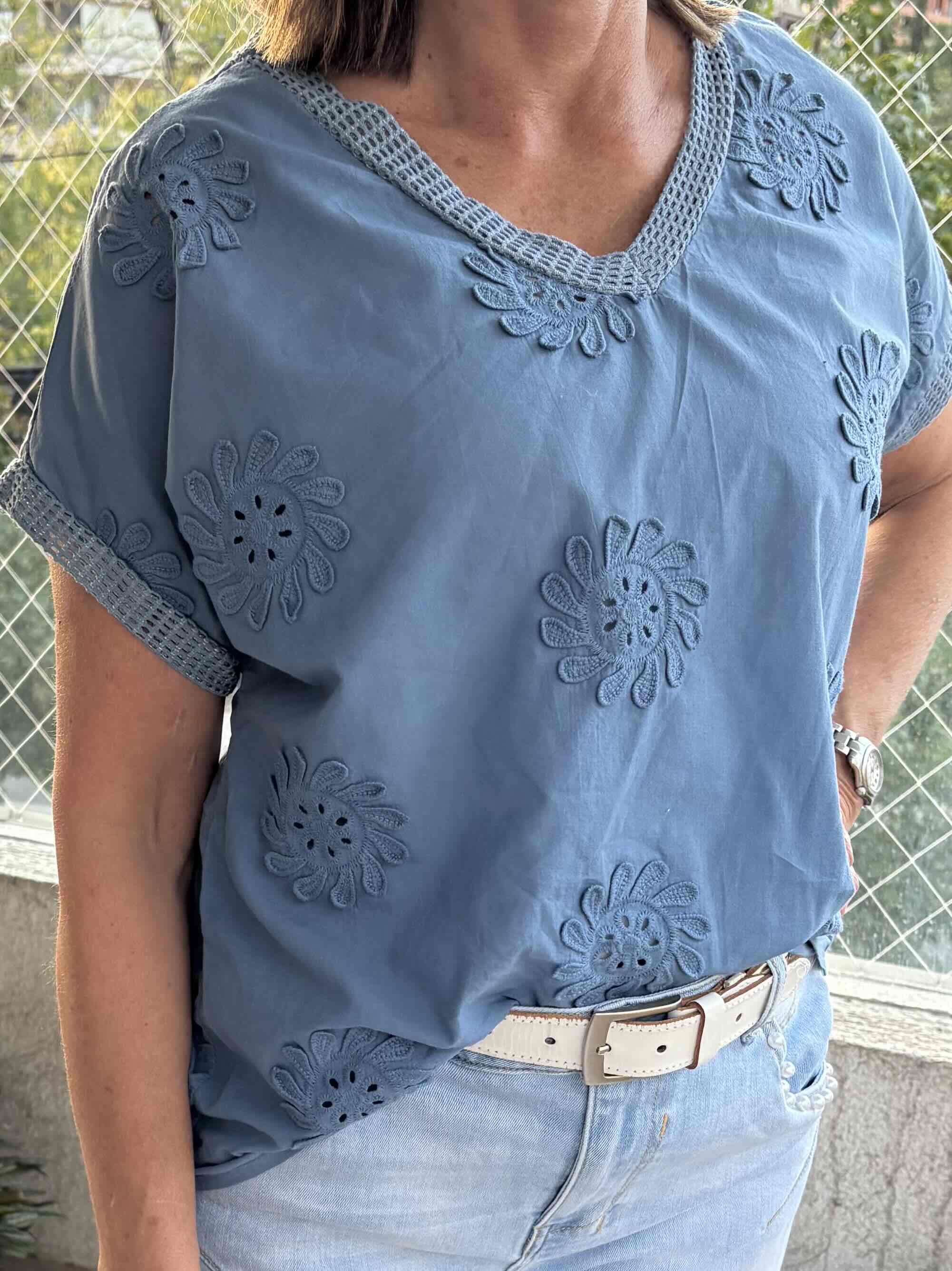 Blusa azul con bordado floral