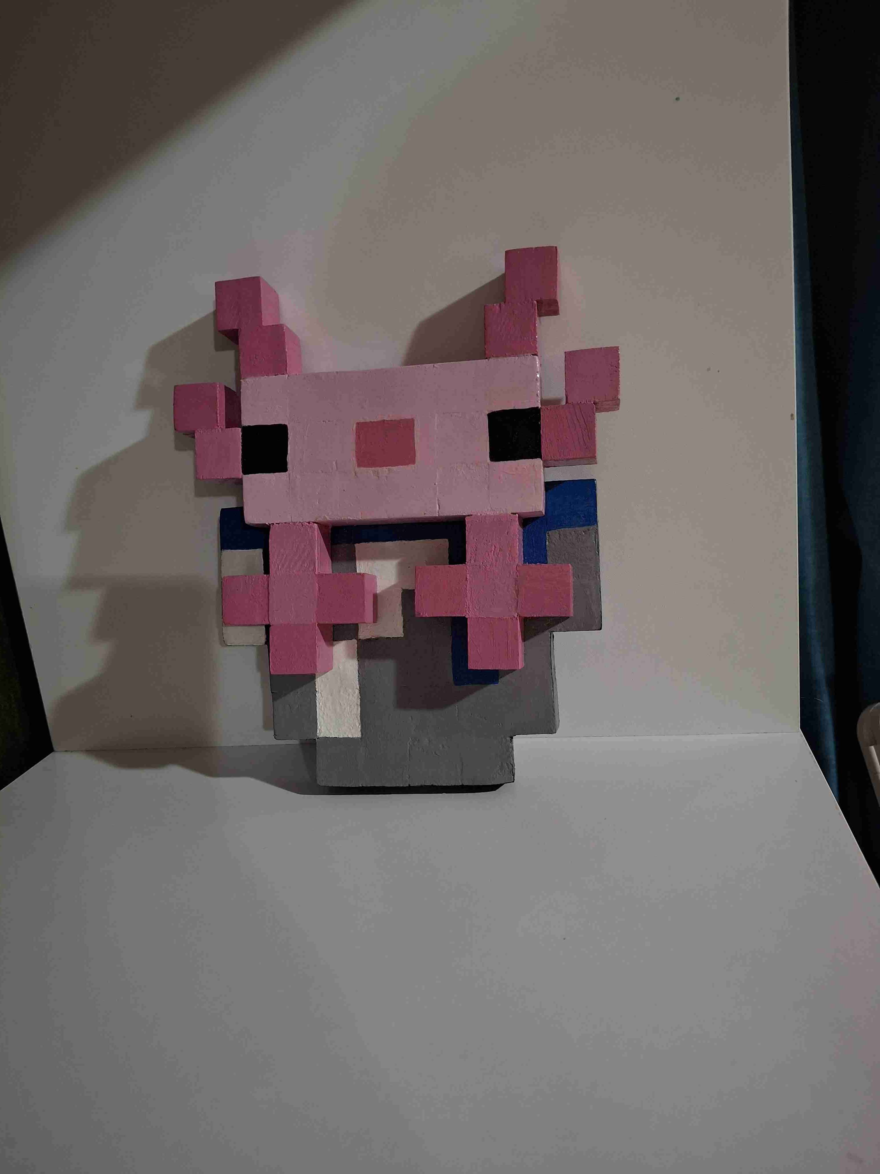 Figura decorativa en estilo pixel art, perfecta para personalizar espacios. Hecho a mano con detalle en tonos rosas y grises. Medidas: 20cm de alto 17cm de ancho