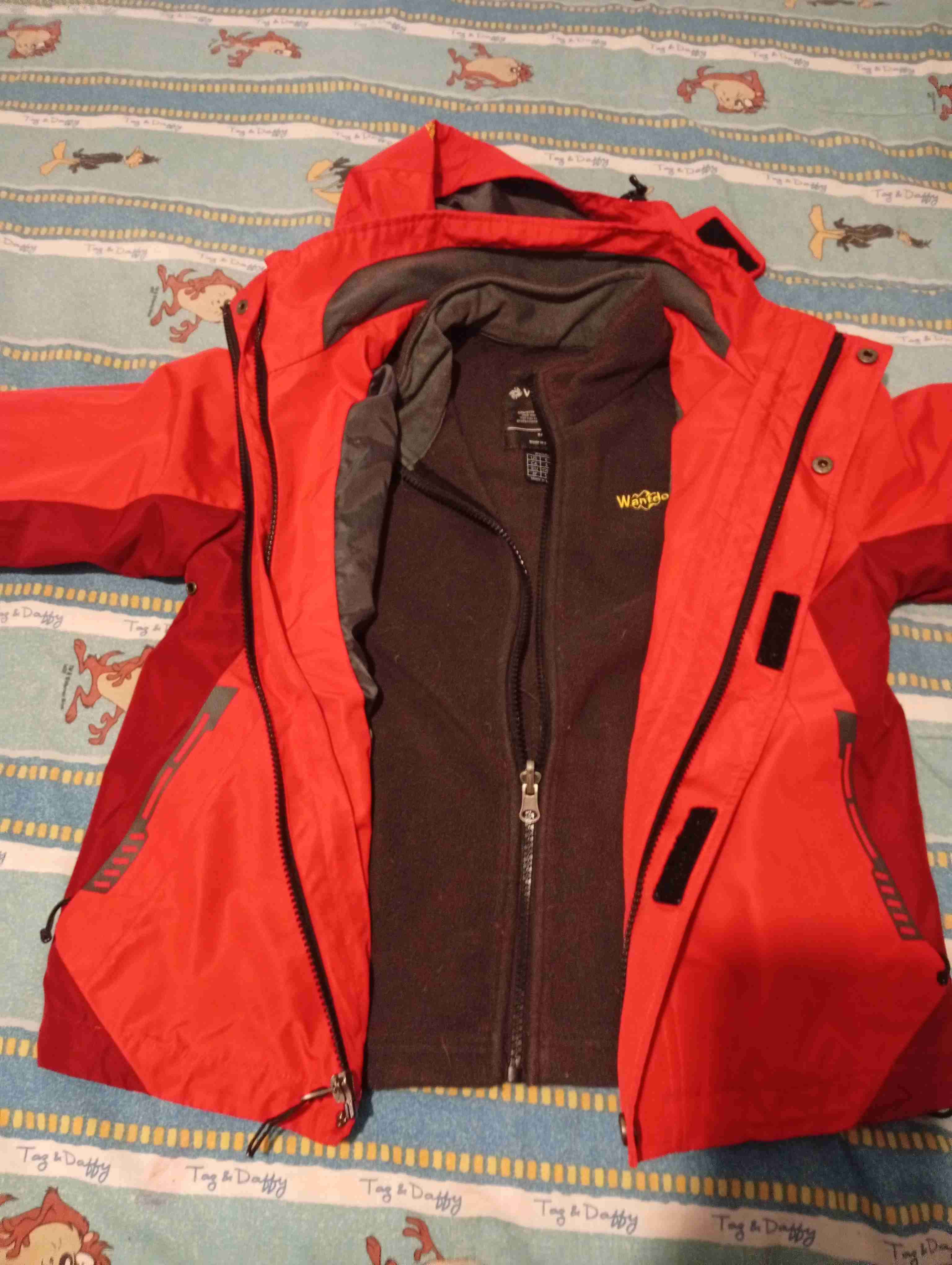 Chaqueta roja con forro desmontable, ideal para días lluviosos. Buen estado, ligera y cómoda.