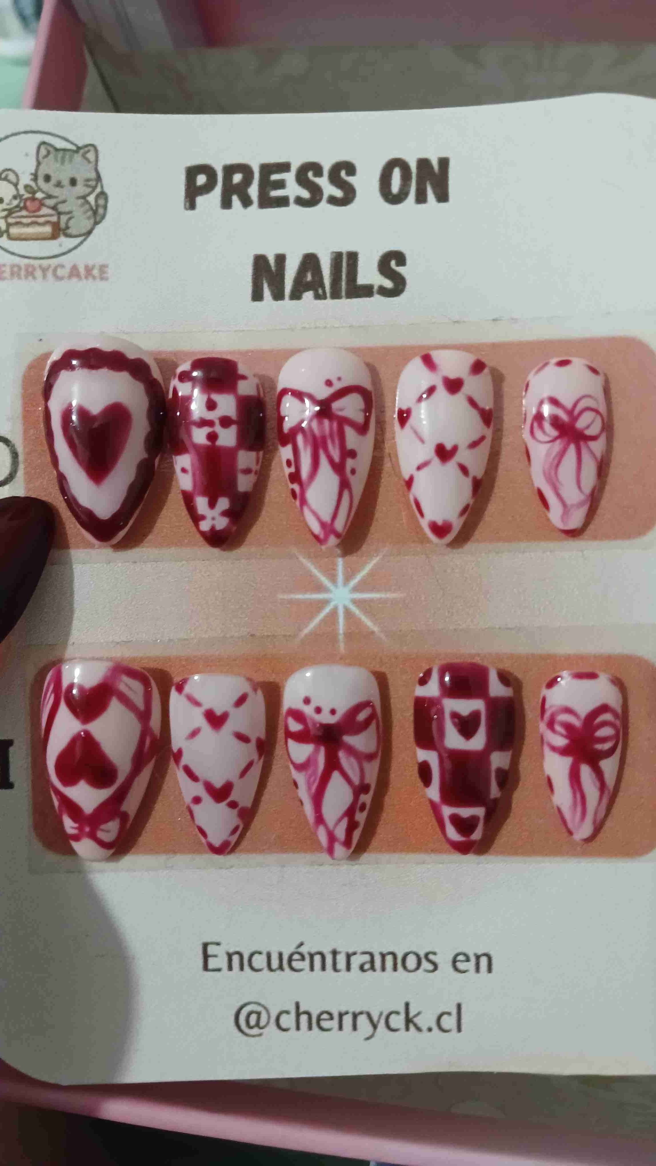 Set de uñas postizas con diseños en rojo y blanco, ideal para una ocasión especial. En buen estado.