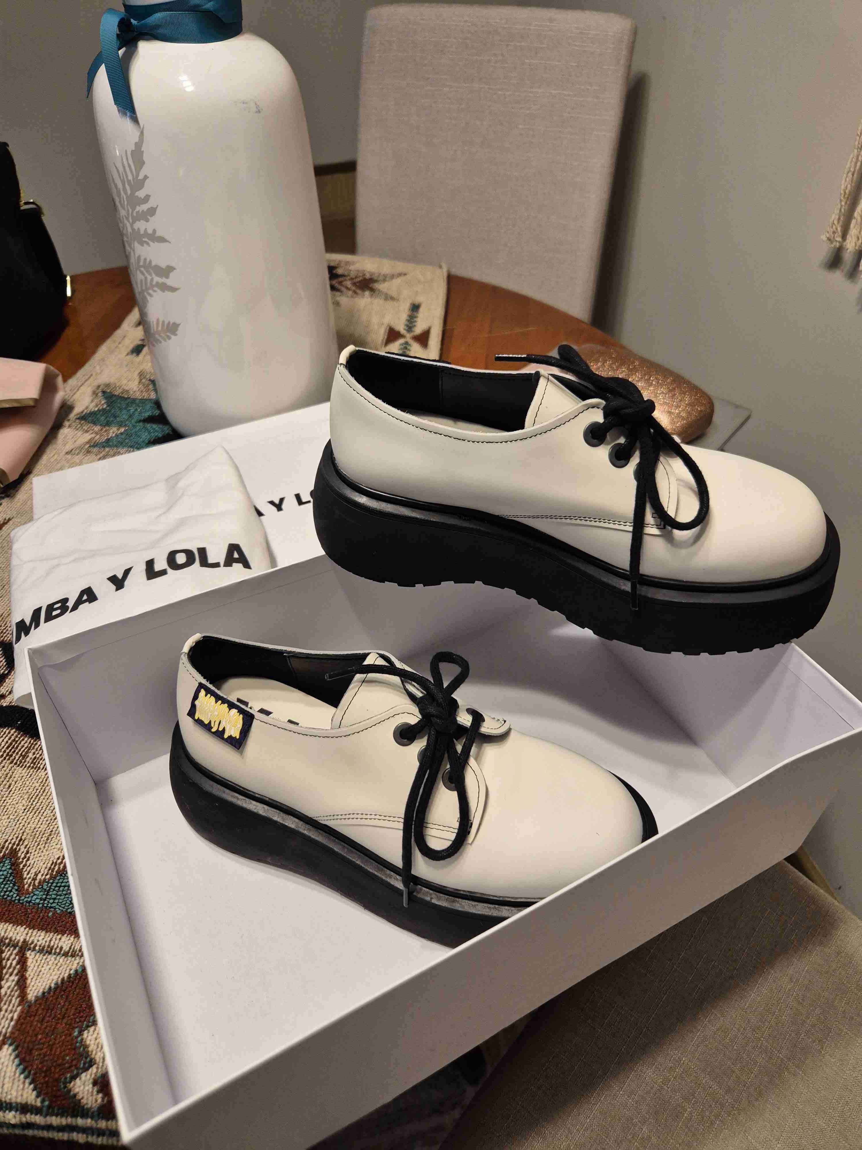Elegantes zapatos de cuero blancos con plataforma negra y cordones. Perfectos para un look moderno y sofisticado. Bimba y Lola