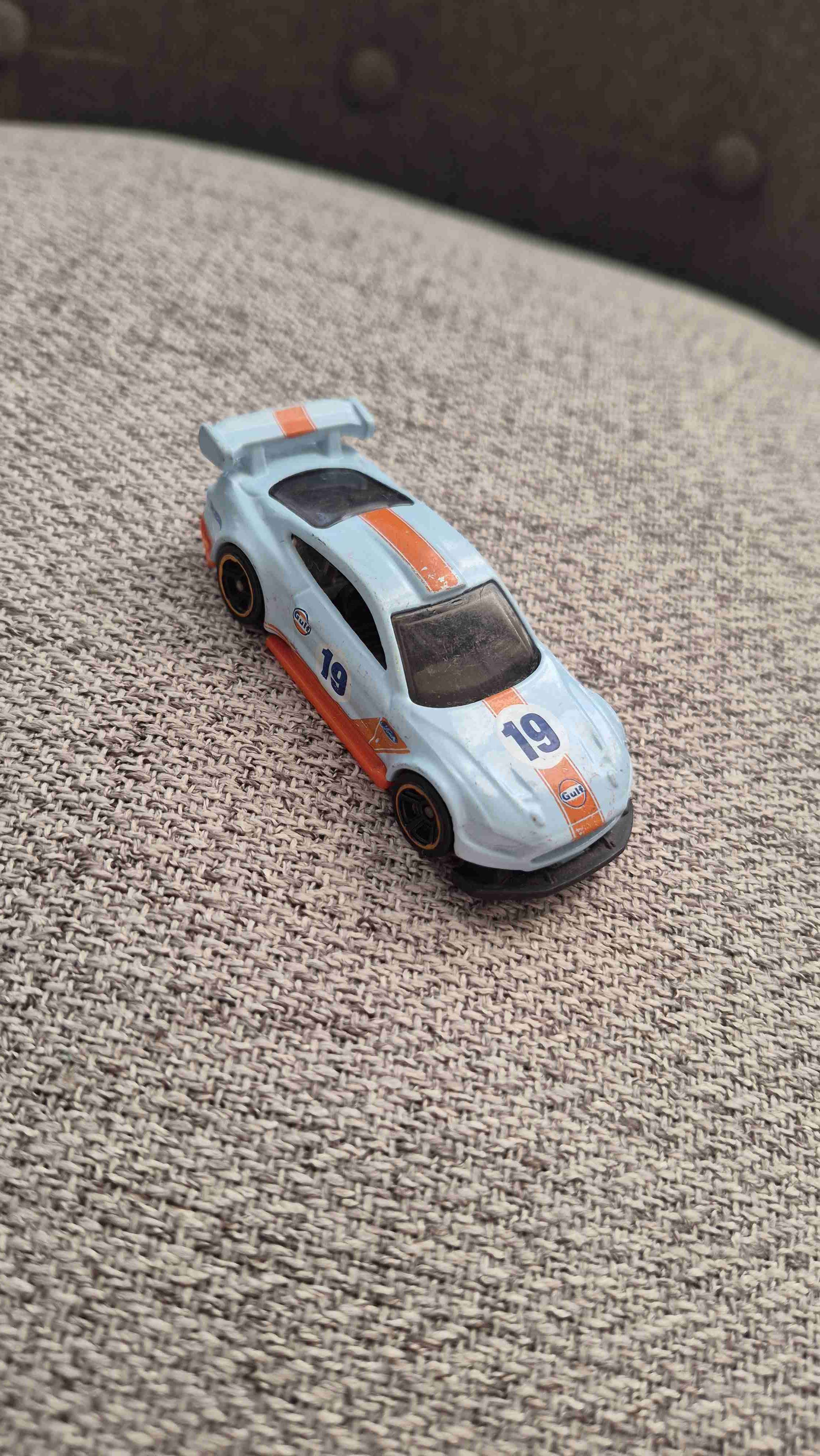 Pequeño auto de juguete en color azul con detalles naranjas. Ideal para colección o para jugar. Buen estado general.