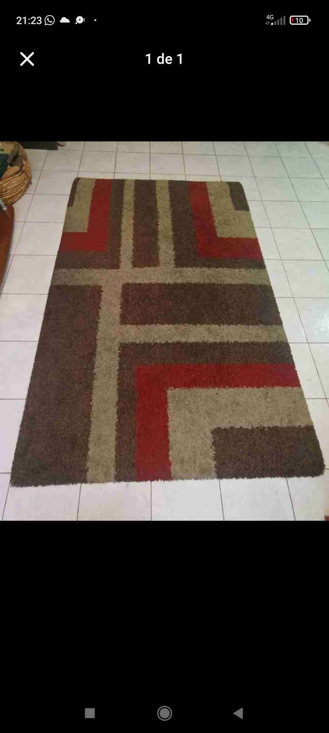 Alfombra con diseño geométrico en tonos marrón, beige y rojo. Ideal para sala de estar, en buen estado general. 230cm x 160cm
