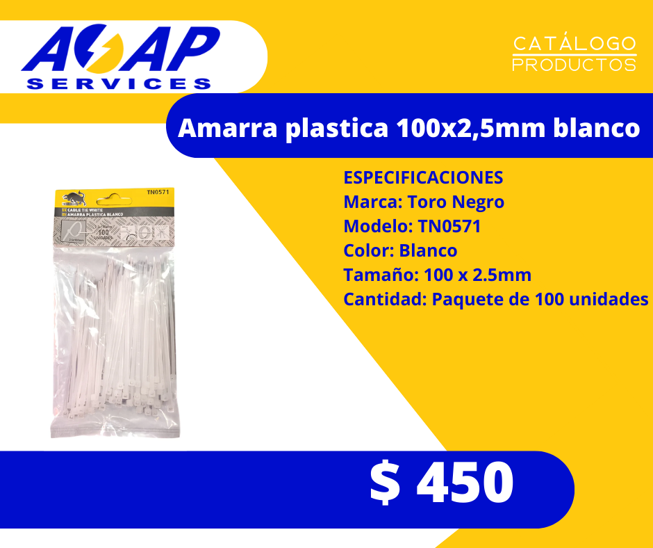 ¡Ideal para organizar cables, cerrar bolsas o realizar reparaciones rápidas en casa! Vendo paquete sellado de amarras plásticas (sujeta cables) de alta resistencia. Especificaciones técnicas: Marca: Toro Negro (Calidad garantizada). Modelo: TN0571. Color: Blanco. Medidas: 100 mm de largo x 2.5 mm de ancho. Cantidad: 100 unidades por paquete. Estado: Nuevo, en su empaque original.