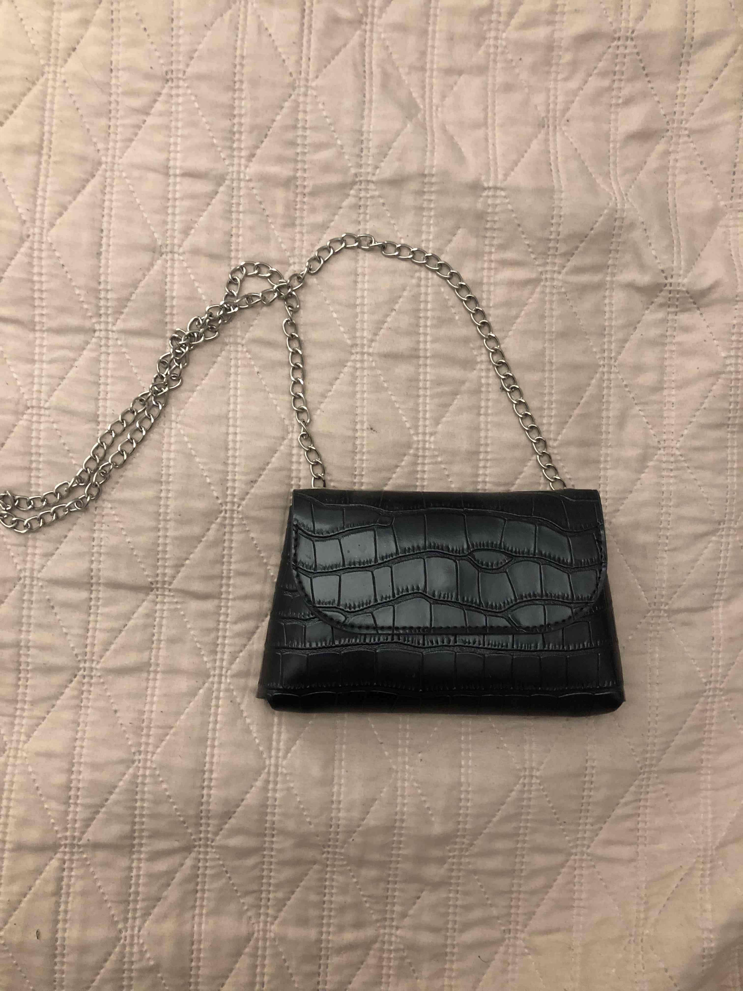 Elegante cartera negra con textura de cocodrilo y cadena metálica. Perfecta para ocasiones especiales.