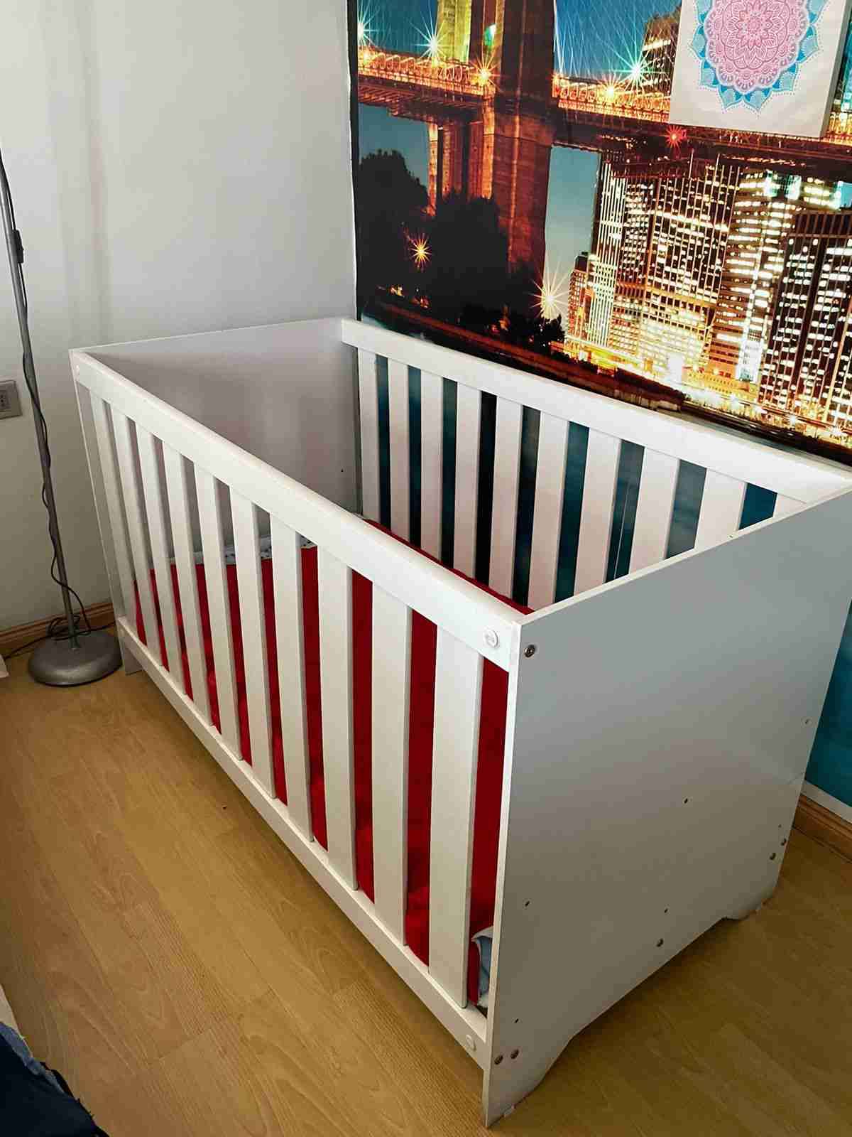 Cuna de bebé en buen estado, color blanco. Ideal para habitación infantil, 3 meses de uso, con colchón incluido, puede transformarse en sofá o cama para niño