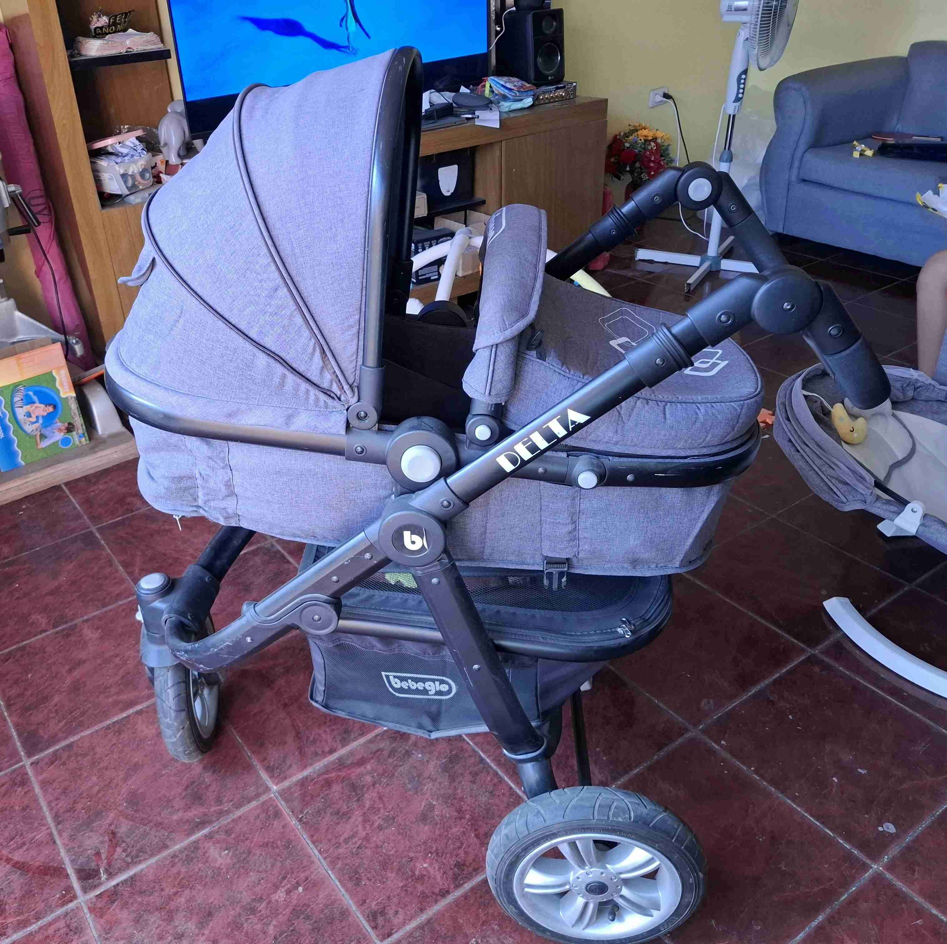 Coche de bebé Bebeglo en buen estado, color gris, con manillar ajustable. Ideal para paseos cómodos y seguros.