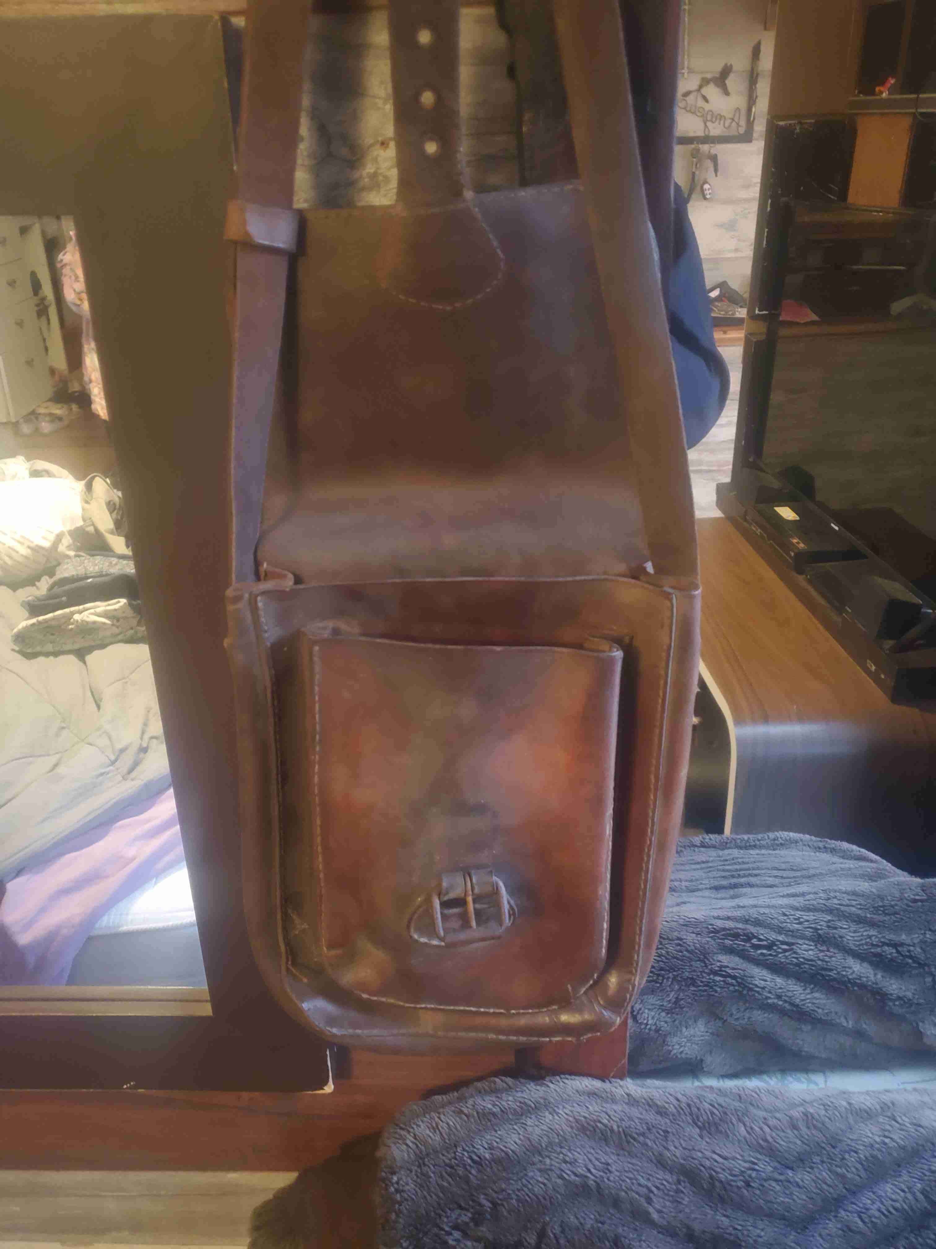 Bolso bandolera de cuero marrón con bolsillo frontal. Ideal para un look casual y vintage. En buen estado.