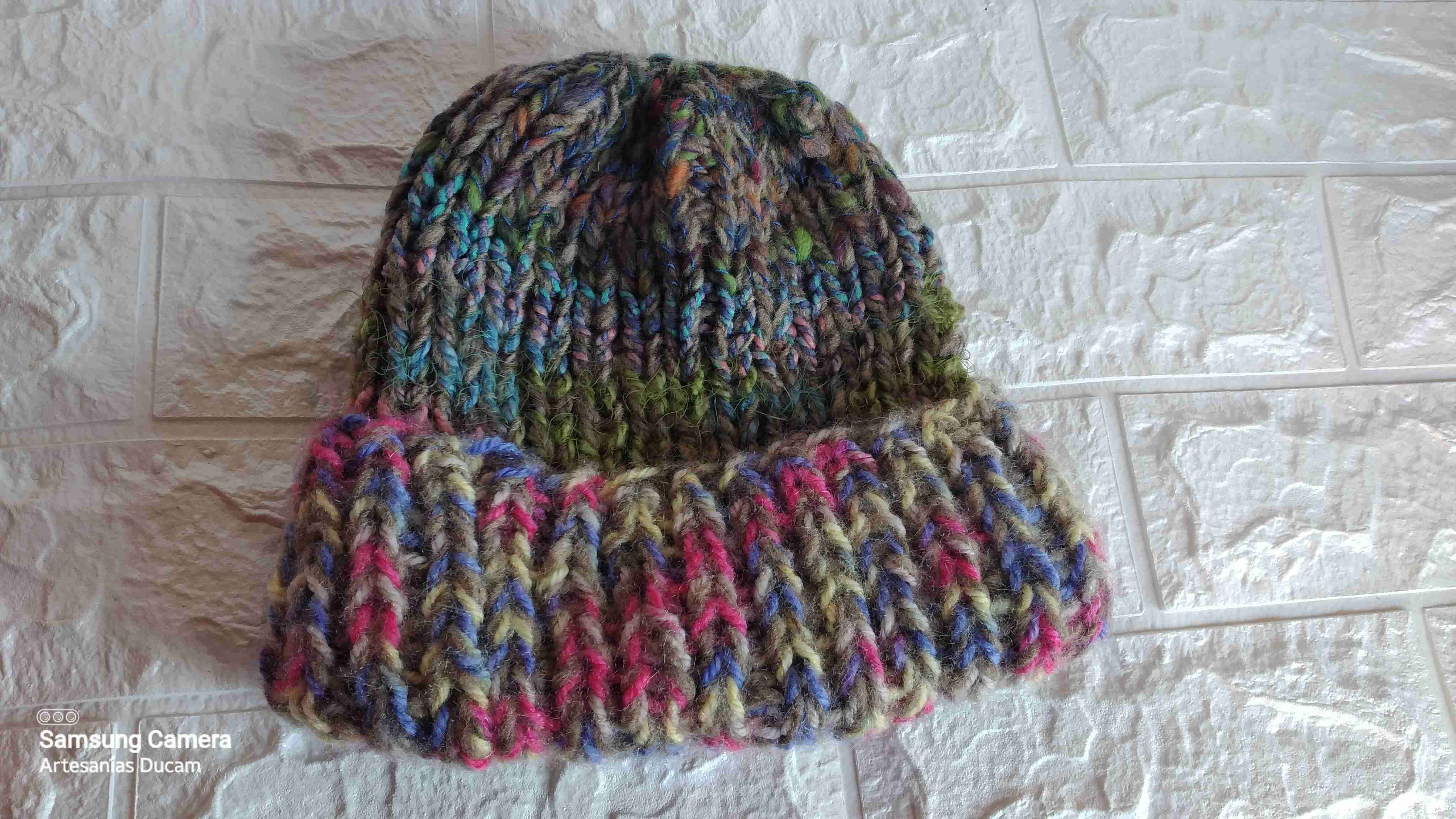 Gorro de lana tejido a mano, ideal para el invierno. Diseño único y colorido.50 % hilado a mano 50 % hilo acrílico