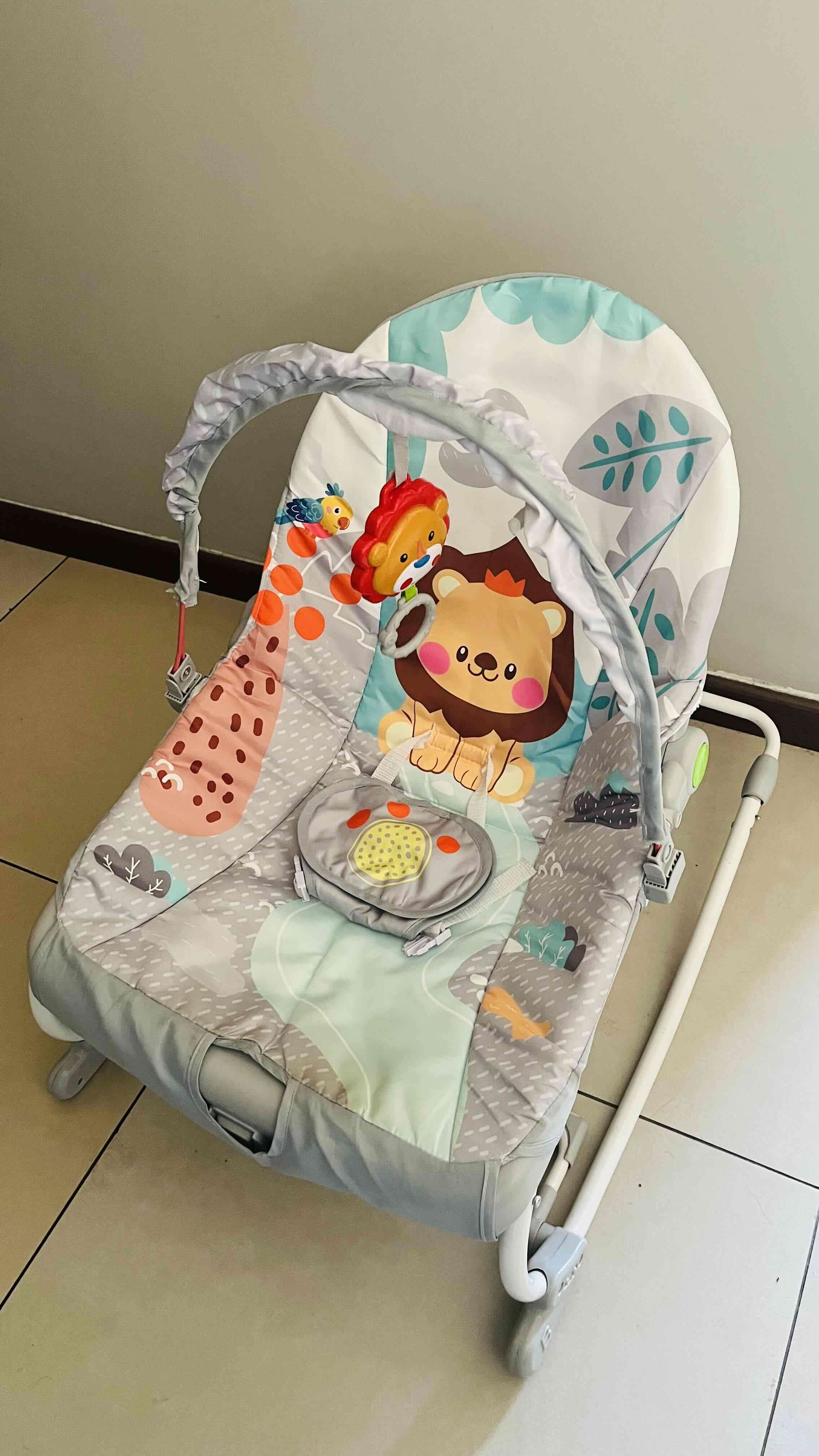 Silla mecedora de bebé con diseño de león, en muy buen estado, ideal para entretener al bebé. Incluye 1 juguete colgante.