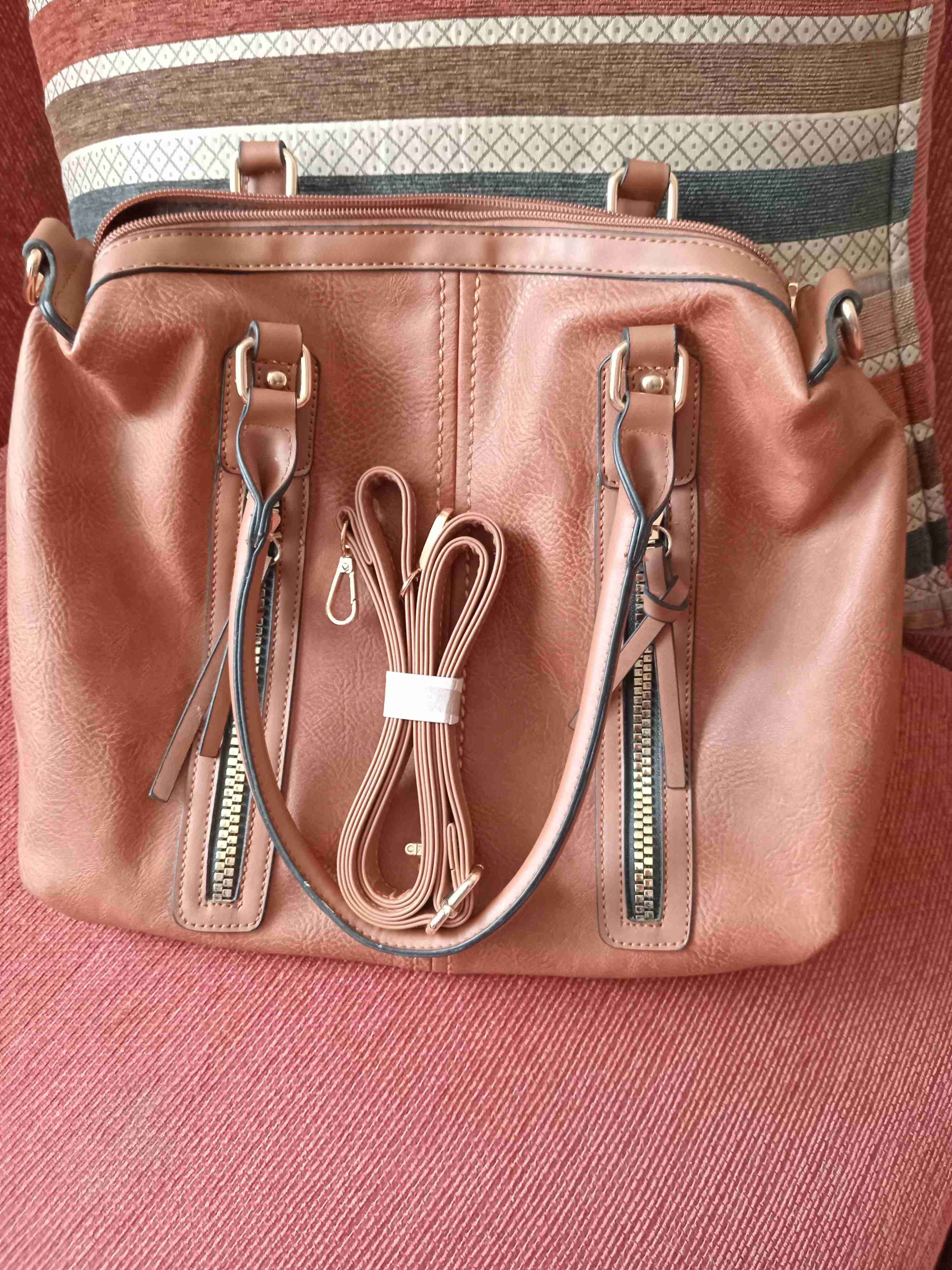 Elegante bolso marrón con detalles de cierres. Ideal para uso diario.