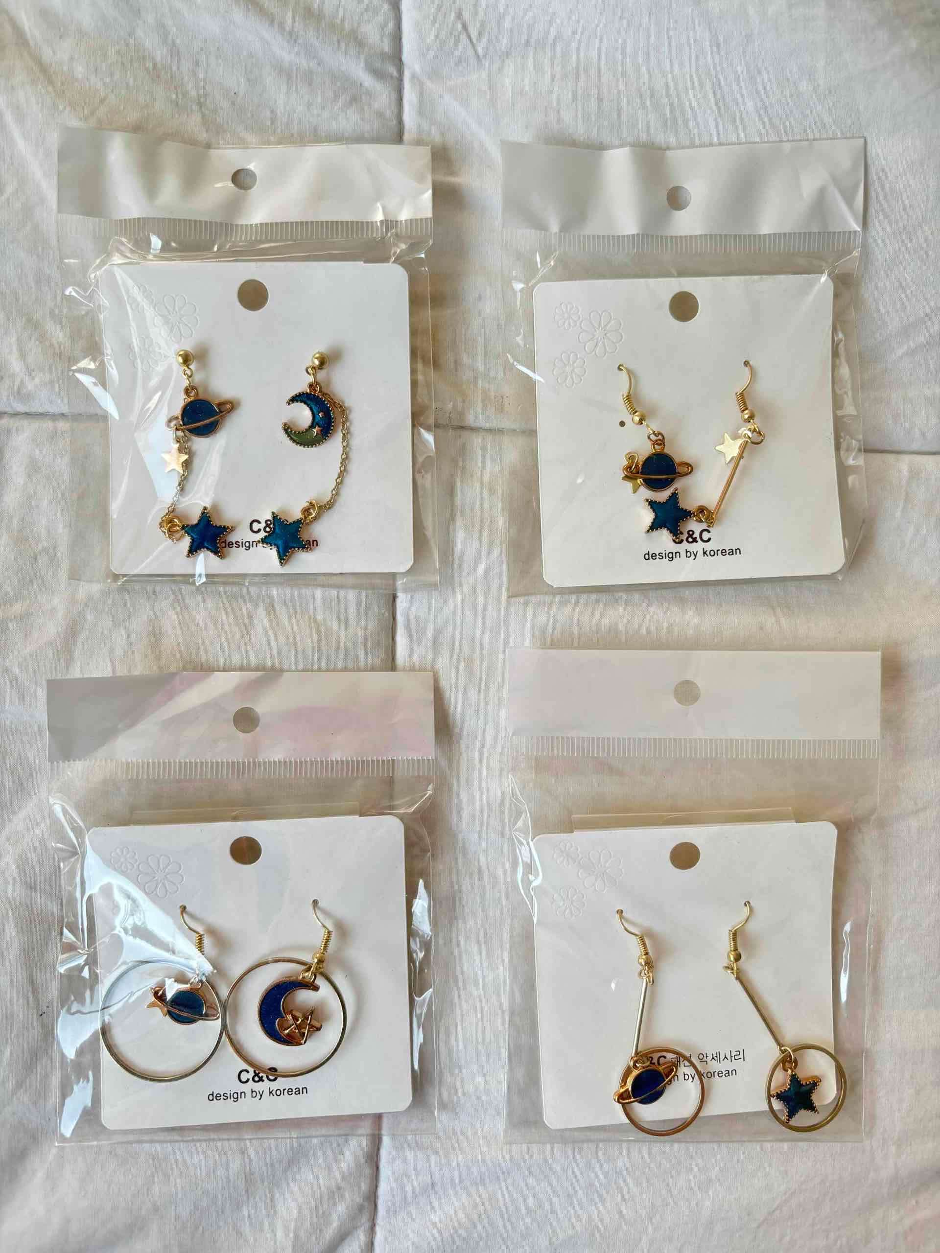 Aros con diseños inspirados en planetas y estrellas, completamente nuevos a $2.000 cada uno y el set completo a $5.000. Se hacen entregas en metro a convenir o envíos por pagar por la aplicación.