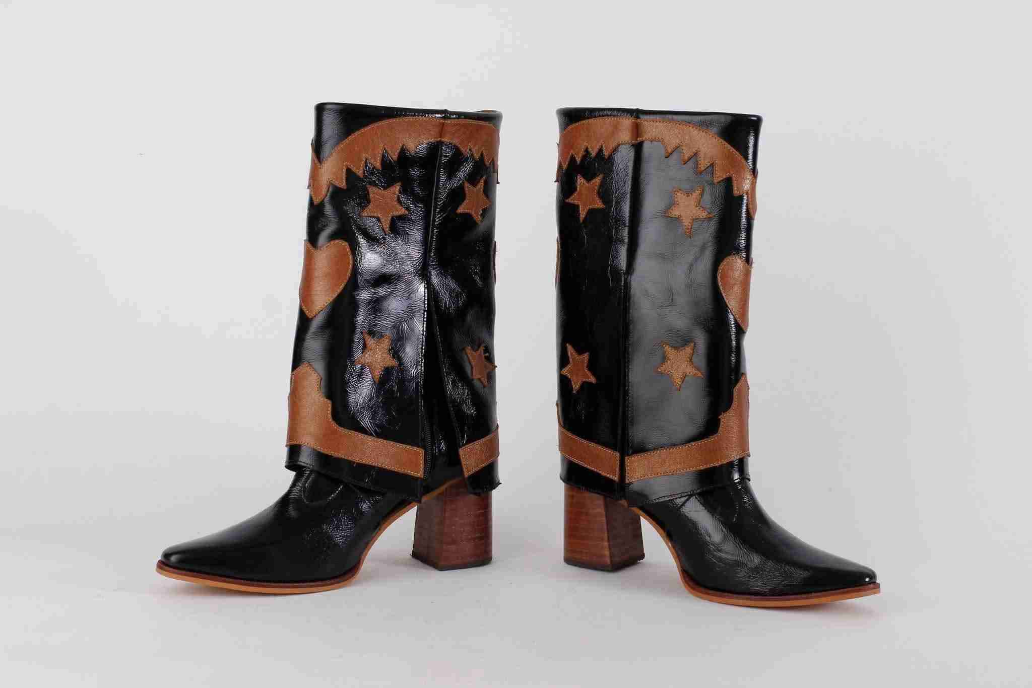 Botas estilo vaquero en color negro con detalles en cuero café. Buen estado, perfectas para un look occidental con un toque fashion. Botas NUEVAS de cuero n° 39. Nuevas! Color negras con aplicaciones. Para piernas delgadas. Envío por pagar.
