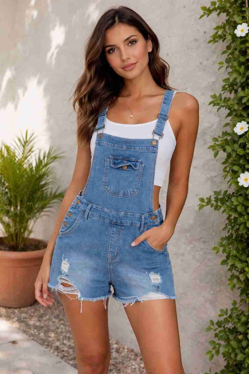 Jardineras de mezclilla con diseño rasgado, perfectas para un look casual de verano. En buen estado. Talla 44 elasticado