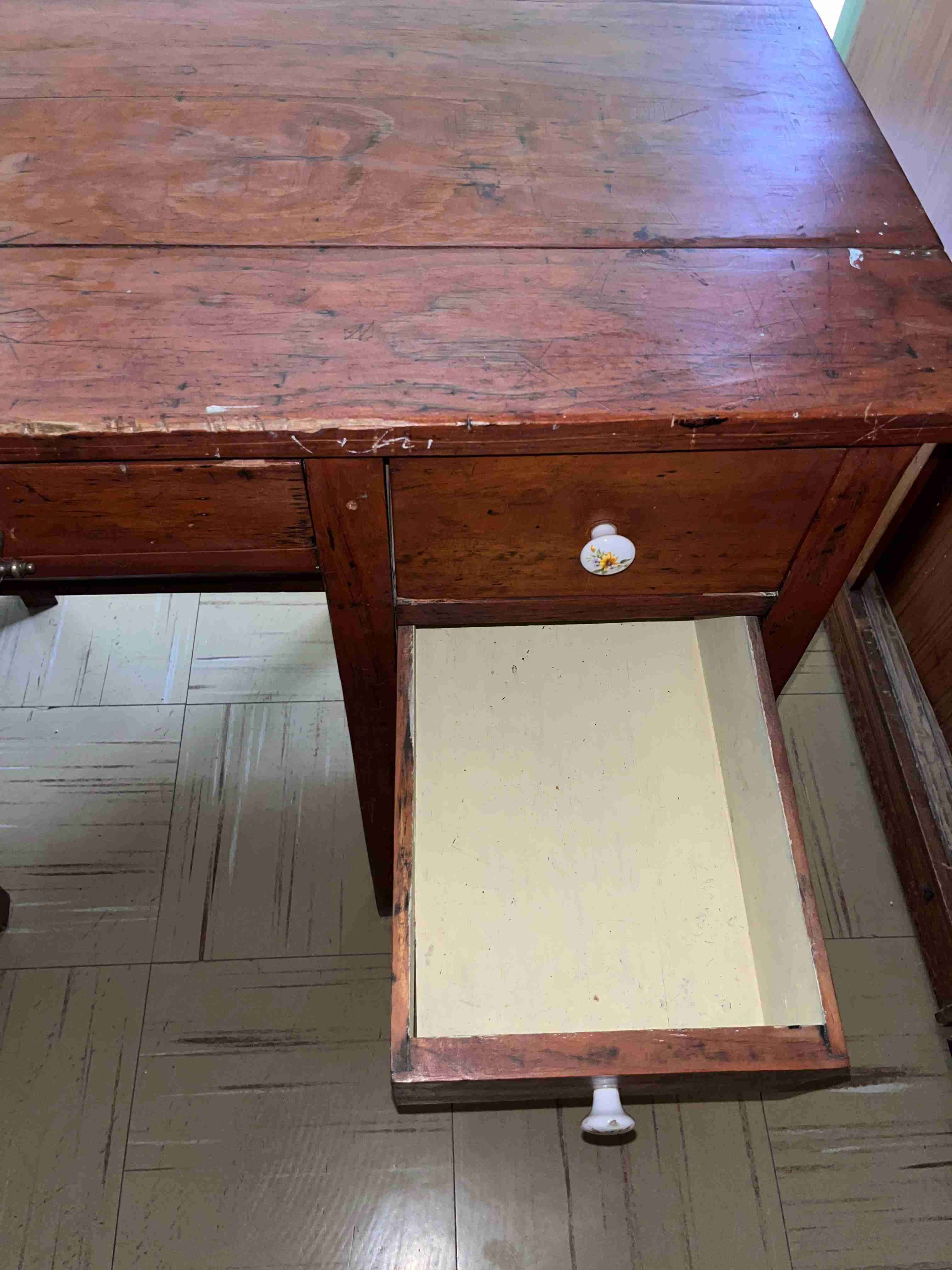 Escritorio rústico con cajón amplio, ideal para oficina o estudio. Presenta signos de uso.