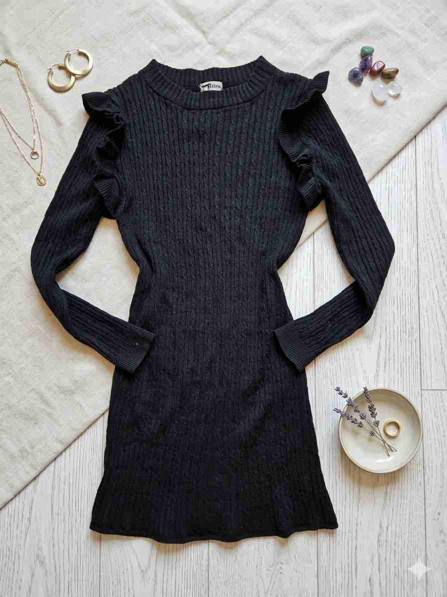 Elegante vestido negro de punto con detalle de volantes en los hombros, perfecto para ocasiones formales. En buenas condiciones, sin desgastes visibles.