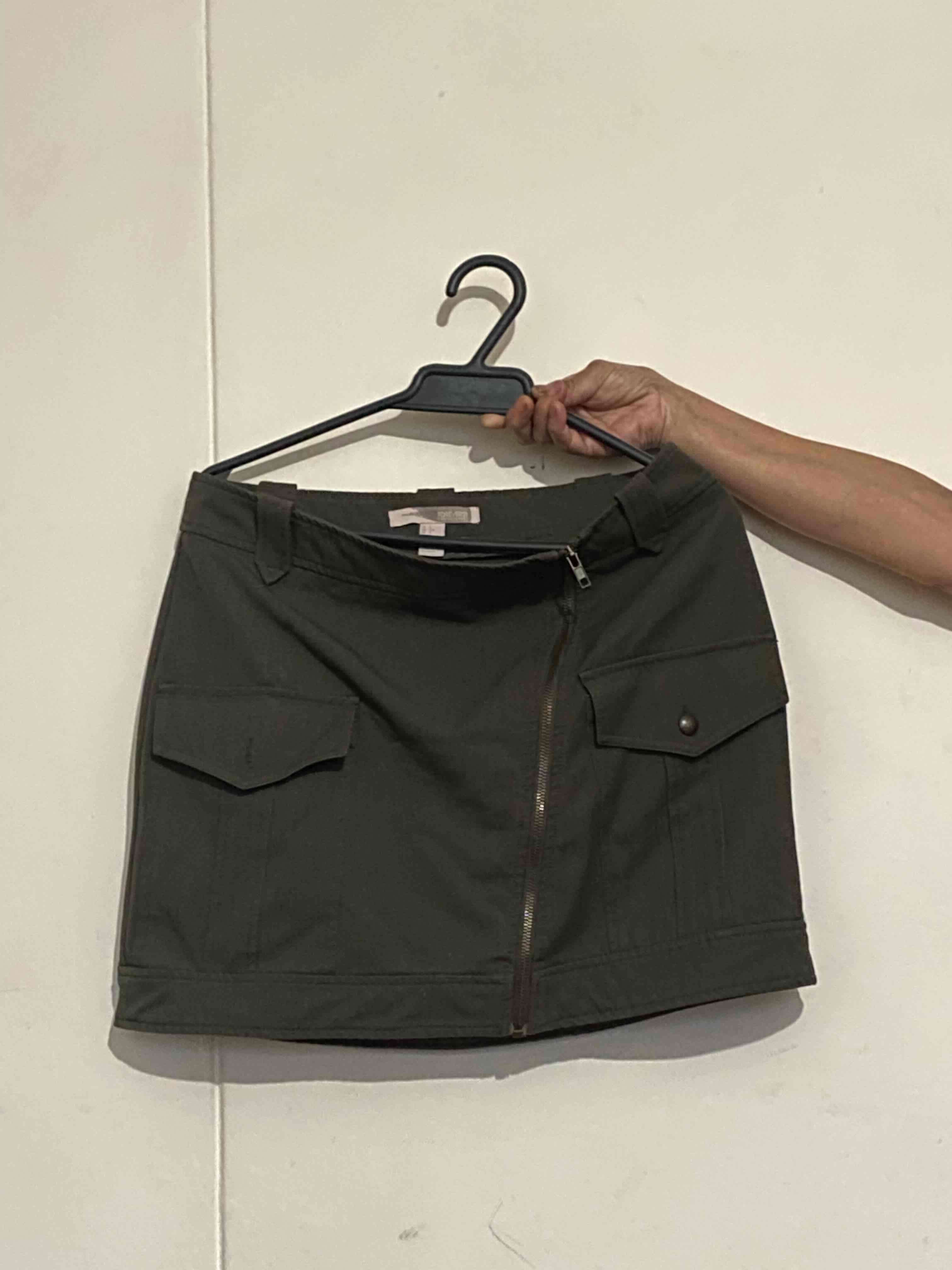Falda corta verde con cierre frontal y bolsillos decorativos, ideal para el uso diario. En buen estado general.