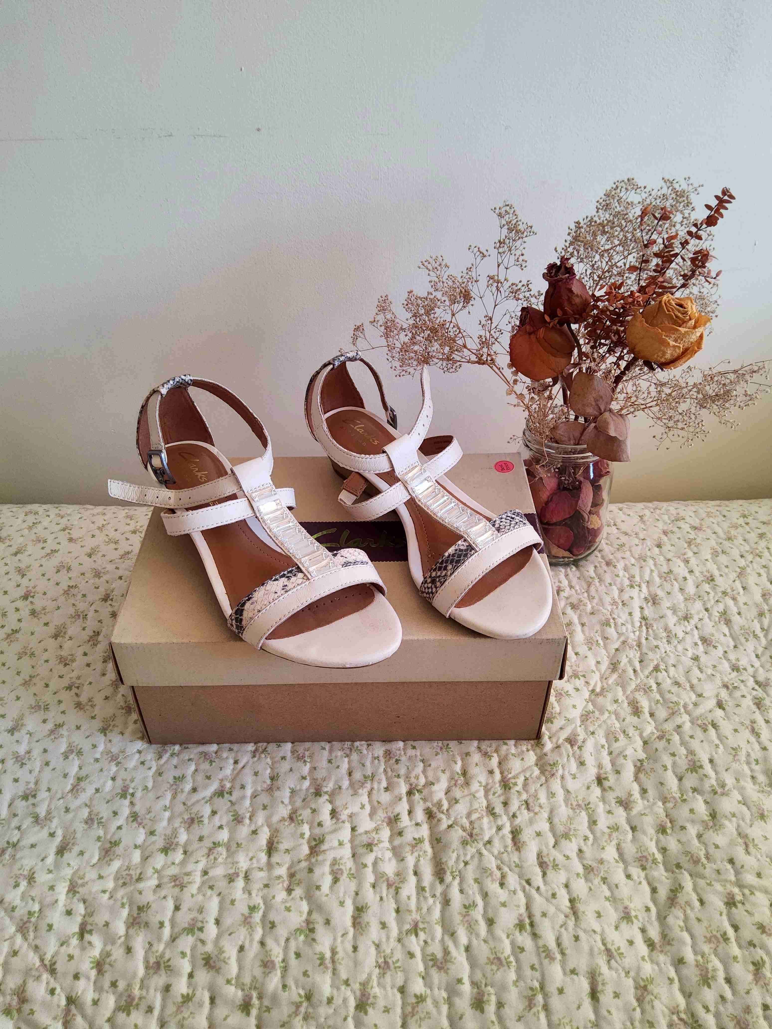 Elegantes sandalias blancas con detalles estampados, perfectas para el verano. En buen estado, ideales para ocasiones casuales o semi-formales.