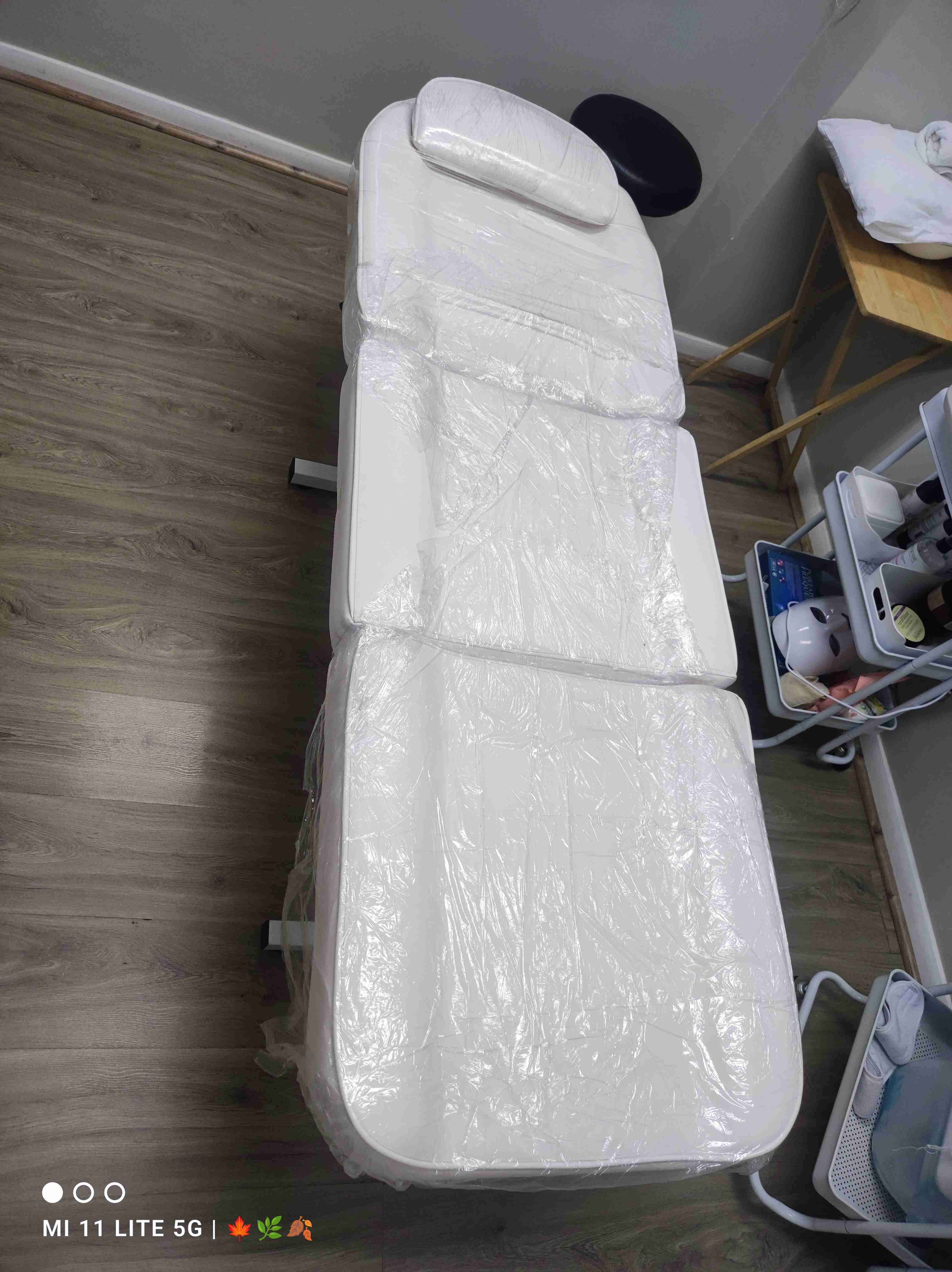 Camilla de masajes blanca, ideal para tratamientos de belleza o terapias. En buen estado general.