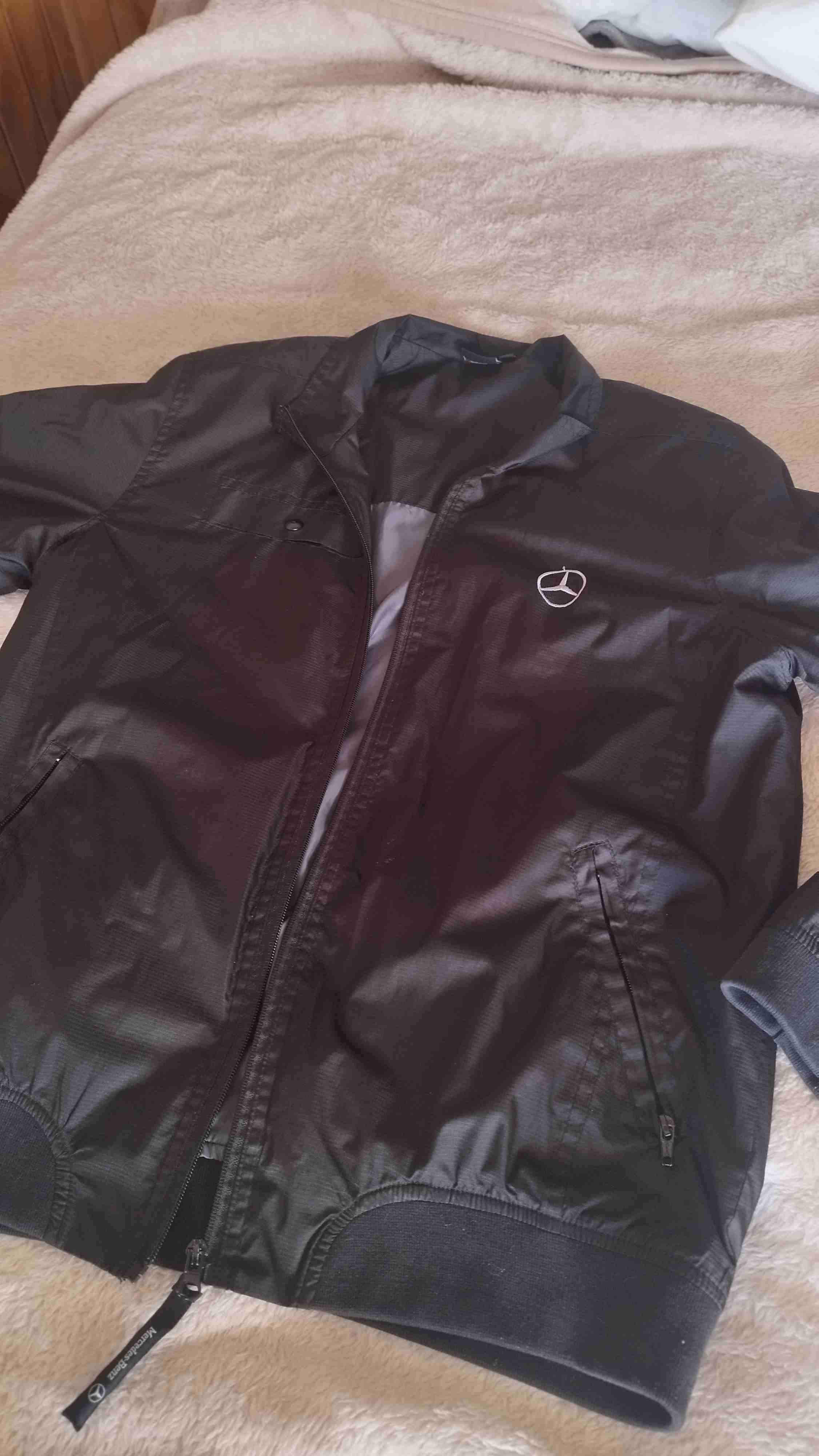 Chaqueta negra estilosa con logo Mercedes-Benz, ideal para días fríos. En buen estado.