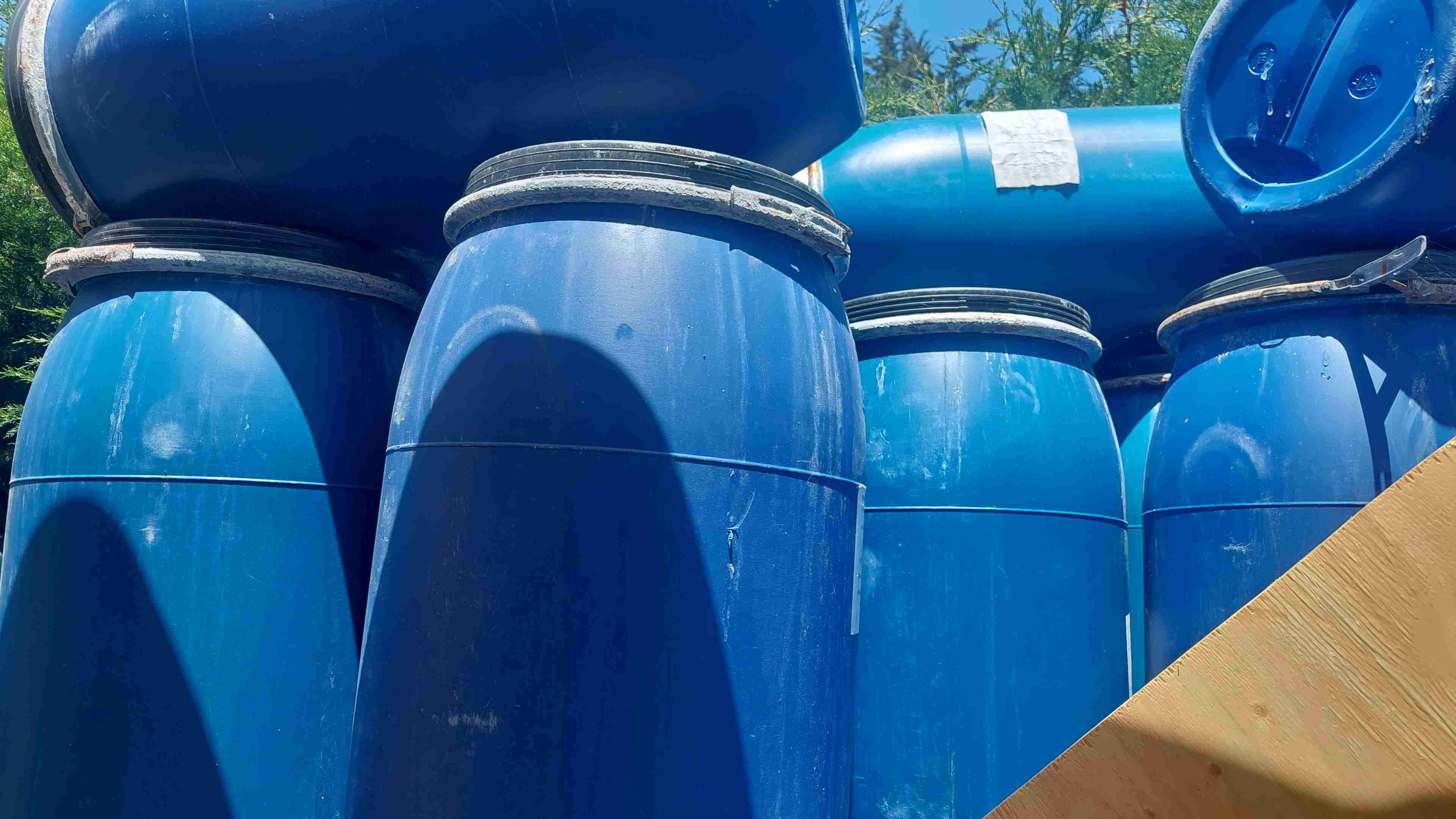 Tambores plásticos de gran capacidad en buen estado, ideales para almacenamiento o uso industrial. Presentan signos de uso. 170 litros
