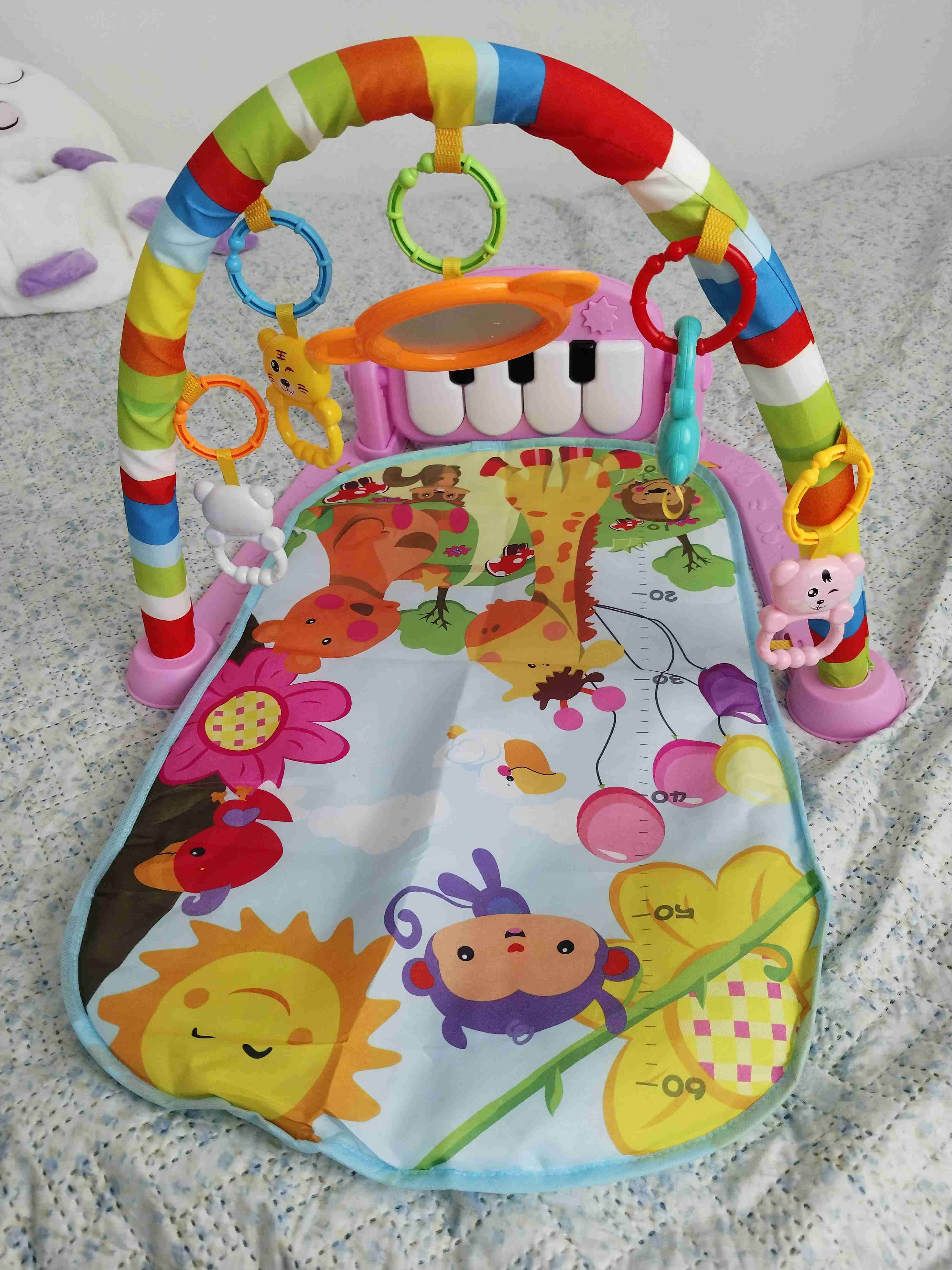 Colorido gimnasio con piano, ideal para estimular el desarrollo del bebé. En buen estado y con diseño de animalitos.