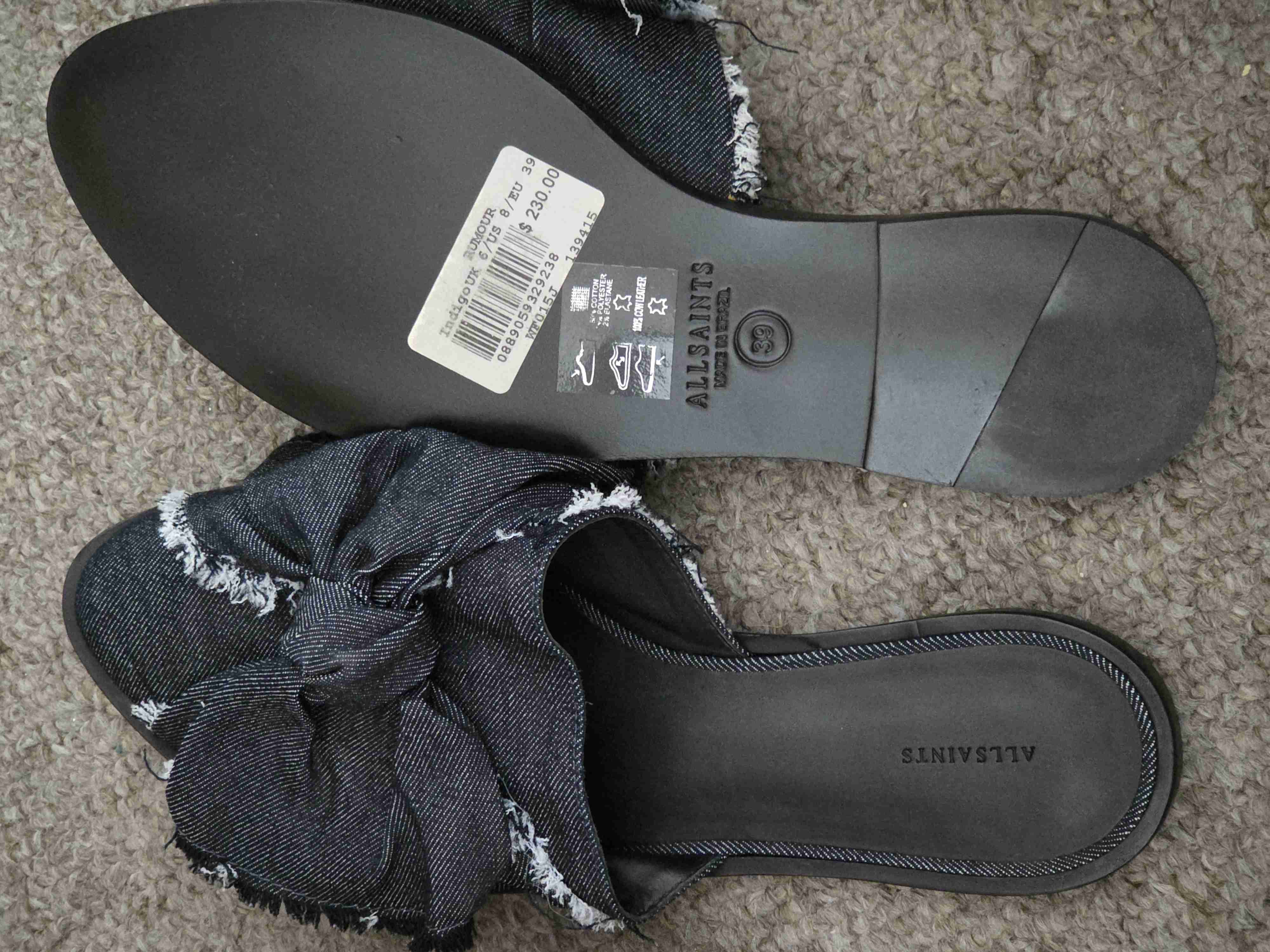 Babuchas AllSaints, color azul mezclilla oscuro, con estilo moderno y moño decorativo. Nuevas.