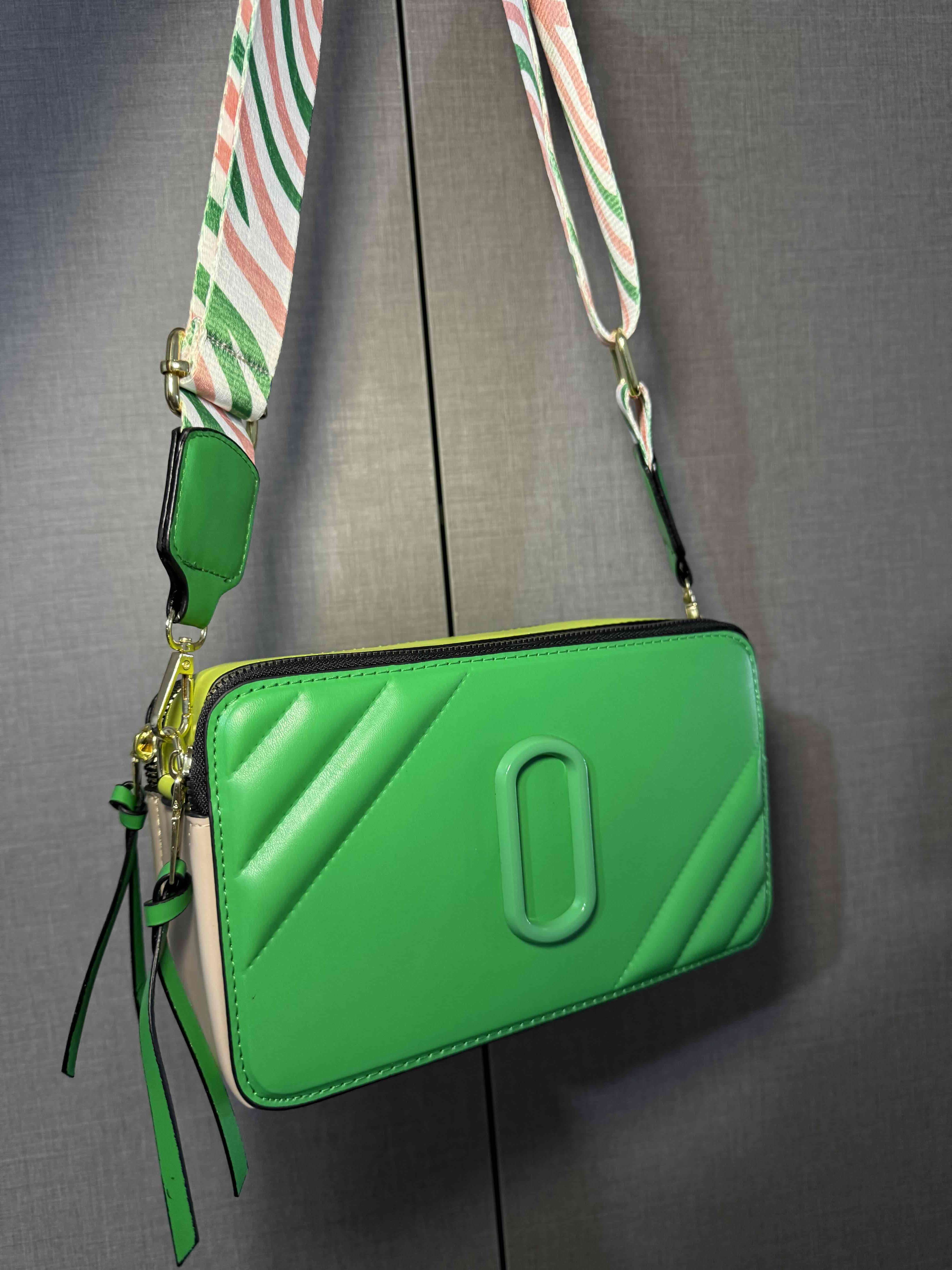 Cartera moderna en verde vibrante con correa ajustable de estampado colorido. Ideal para ocasiones casuales, en excelente estado.
