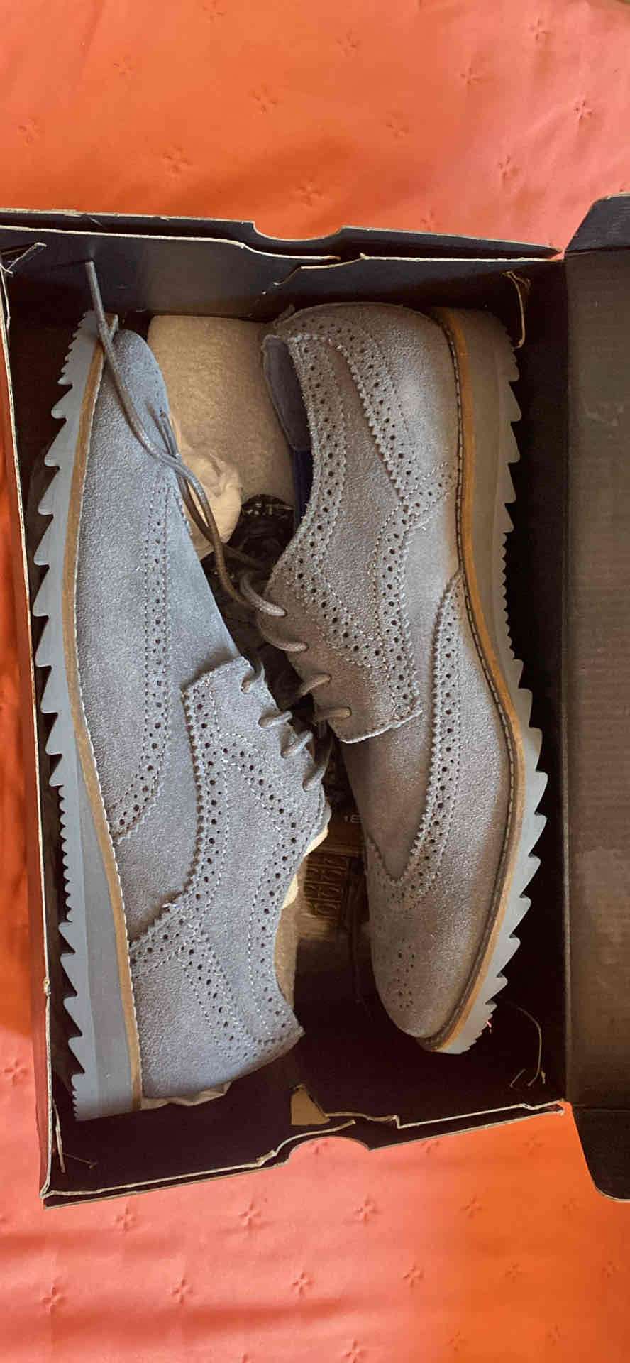 Zapatos elegantes de gamuza gris con diseño calado, en excelente estado. Perfectos para eventos formales o casuales.