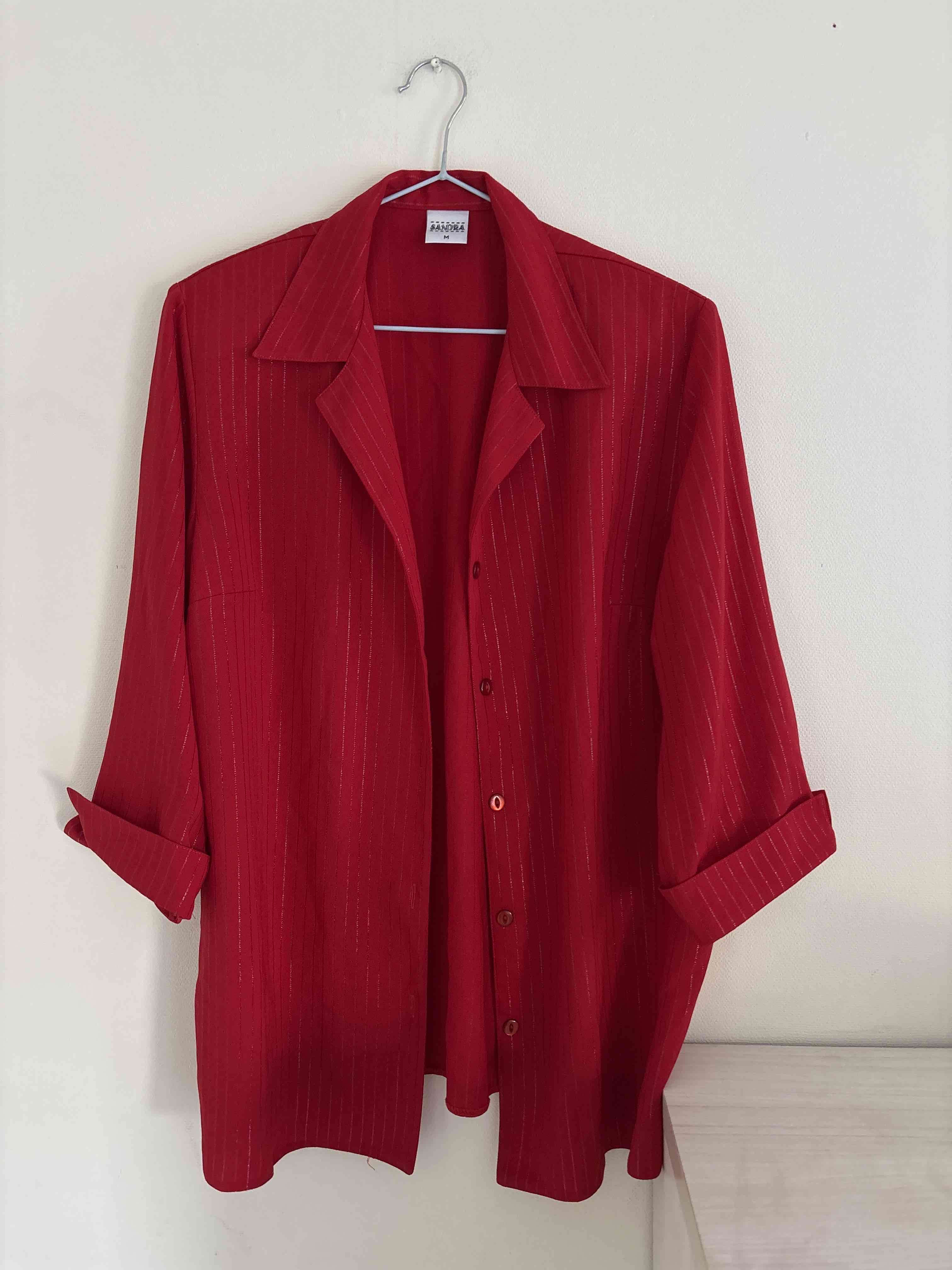Elegante blusa roja con rayas, ideal para ocasiones formales o casuales. En buen estado, mangas largas arremangadas. Es rojo más oscuro que la foto y dice talla M pero es como XL